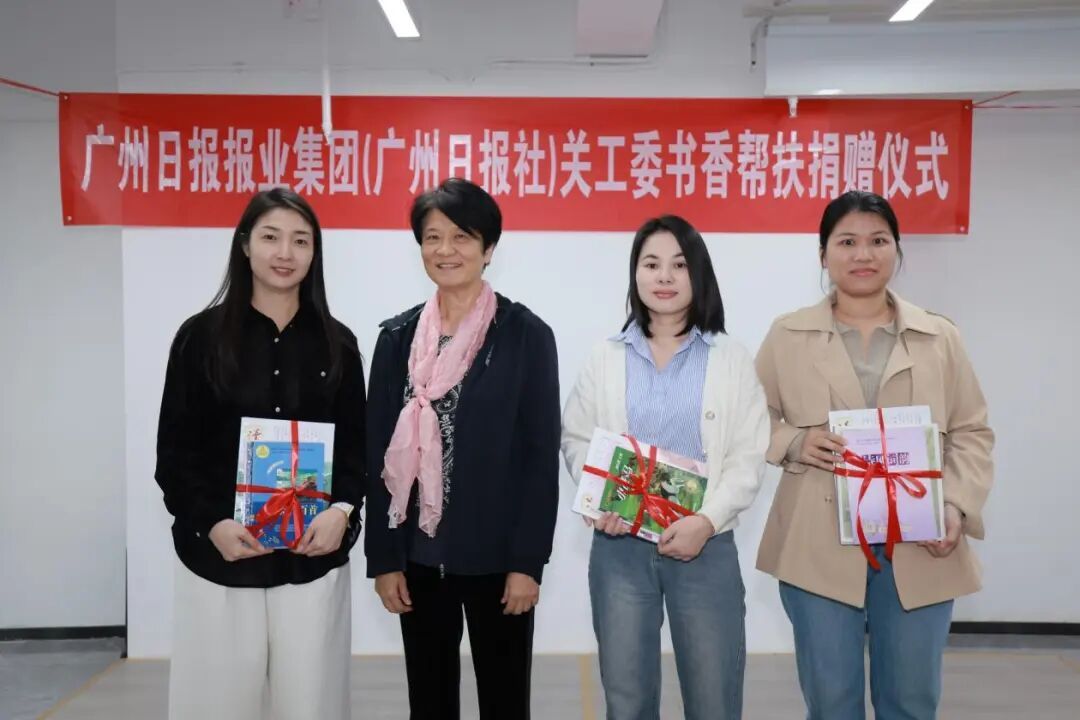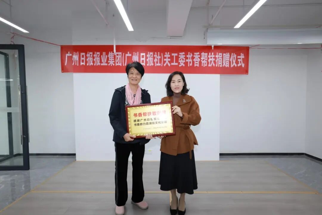 赠书仪式上,广州日报报业集团(广州日报社)关工委把筹集到的800多册知识科普、青少年读物等书籍捐赠给荔湖街荔韵社区、明星村和五一村,荔湖街道办代表向其回赠“书香帮扶致谢牌”牌匾。