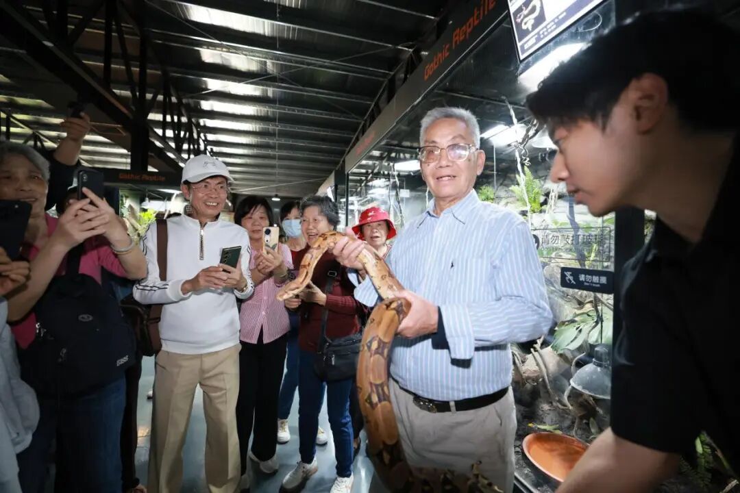 学员不仅能够近距离观察黄金蟒、蜥蜴、变色龙等爬行动物,甚至还能亲自触摸并放在手中把玩,在趣味互动中打破对爬行动物的刻板印象。“黄金蟒的皮肤摸起来好光滑!”“原来豹纹守宫这类爬宠这么可爱!”多位“银龄推荐官”开心分享。