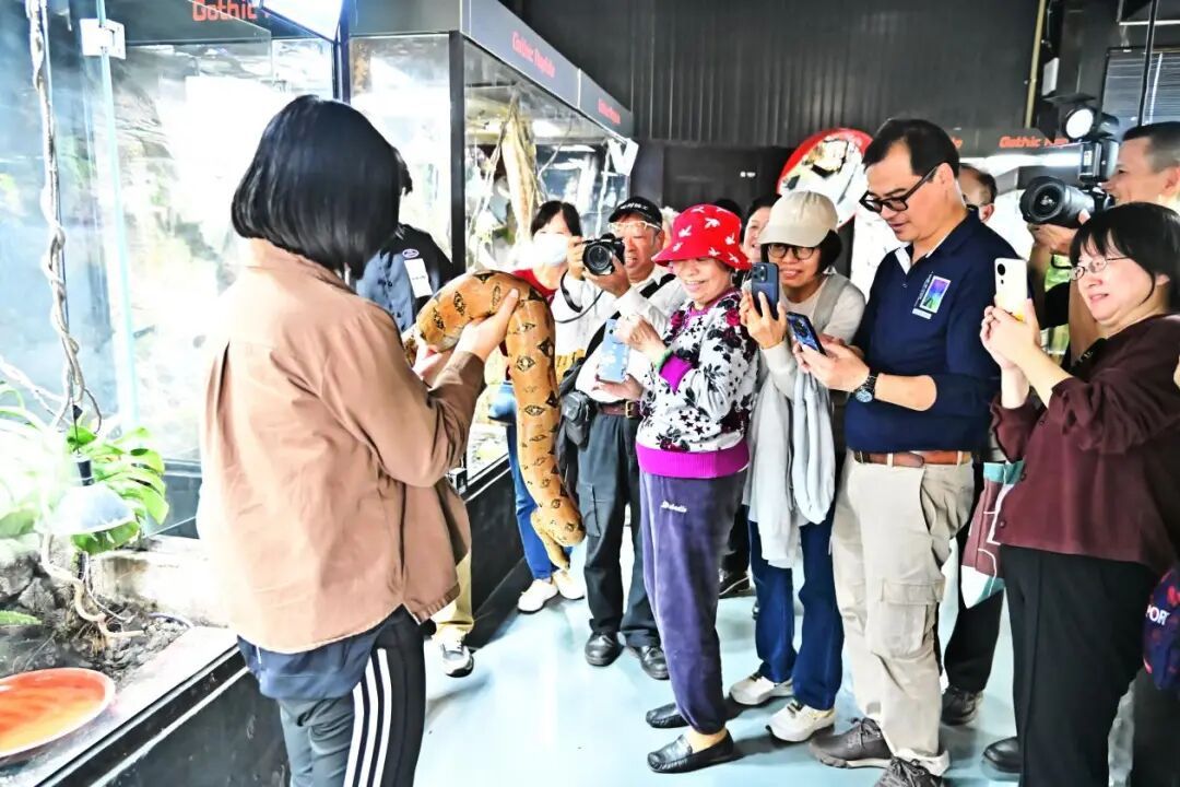 最后,“银龄推荐官”抵达哥特爬宠营地。这个占地7500平方米的综合性科普场馆分为侏罗纪主题公园和爬行动物馆两大区域。馆内8米大型生态混养缸内,龟、蜥蜴、变色龙与小型鸟类共处一室,生动展现自然生态链。营地将自然教育与潮玩体验结合的模式,让科普变得更有吸引力。