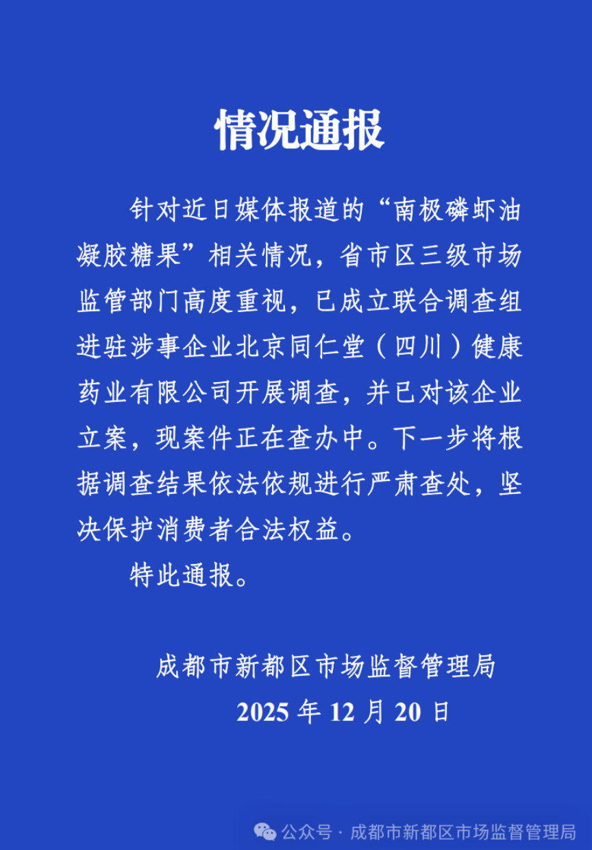 针对近日媒体报道的“南极磷虾油凝胶糖果”相关情况,省市区三级市场监管部门高度重视,已成立联合调查组进驻涉事企业北京同仁堂(四川)健康药业有限公司开展调查,并已对该企业立案,现案件正在查办中。