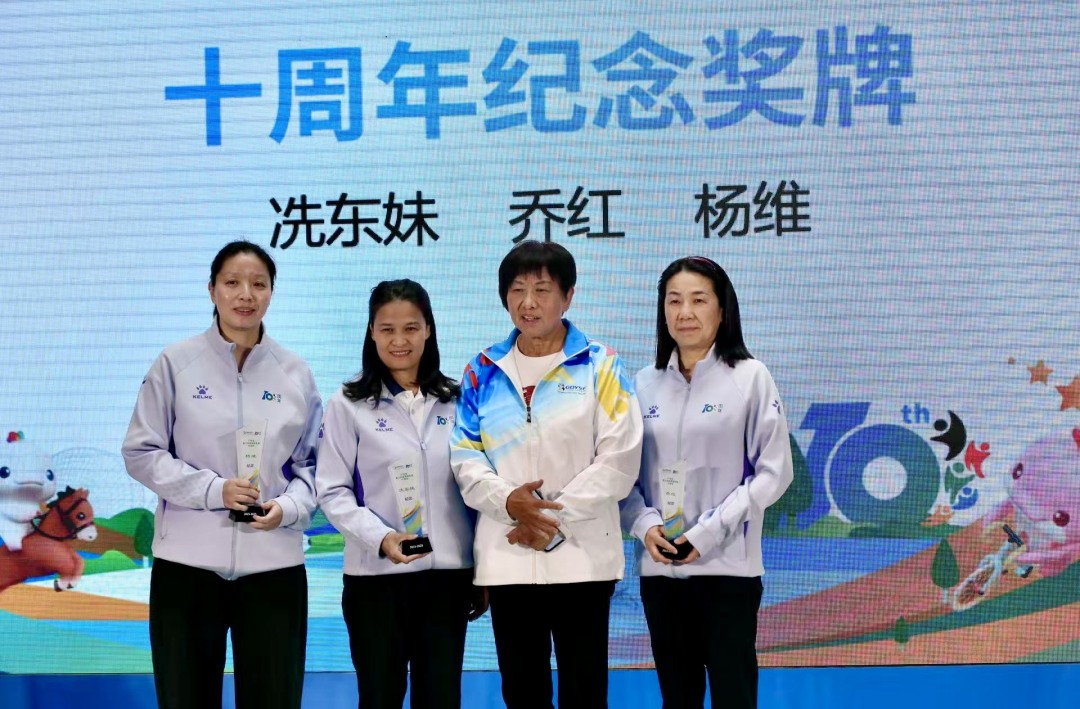 高敬萍(右二)为三位奥运冠军颁发十周年纪念奖牌