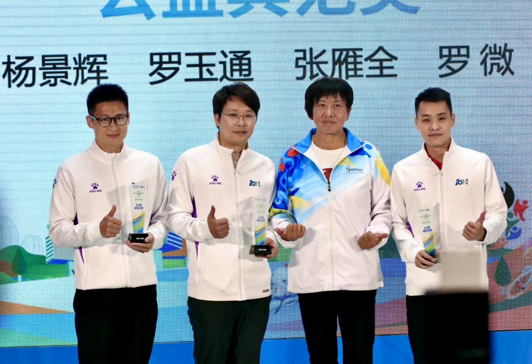 高敬萍为奥运冠军杨景辉、罗玉通、张雁全颁发公益典范奖