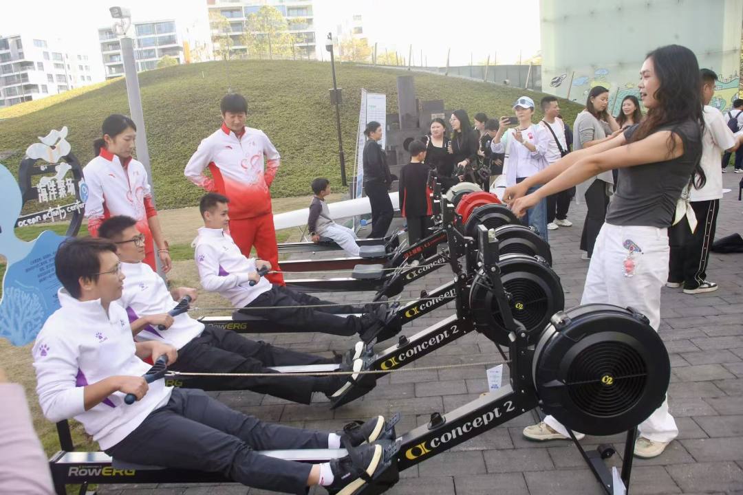 本次嘉年华共设置超过20项潮流运动与科技体验项目,打造了一场全方位的沉浸式运动盛宴。紧张有趣的躲避盘、跳绳比赛吸引了诸多挑战者,小铁人三项、航模、匹克球、无人机足球、机器人互动、跑酷、攀岩、腰旗橄榄球等体验区也吸引了大批孩子与家长共同参与。海岸赛艇体验区更迎来重磅嘉宾——第十五届全运会金牌得主王云飞、张桂萍现场指导粤港两地的运动员进行交流,让青少年提前感受这项奥运新项目的魅力。此外,现场特别设置的“小小运动会”与“大湾区青少年体育发展项目”专区,则将体育与科技、趣味与竞技深度融合。作为青体联十周年特别环节,“时光寻宝”活动别开生面,孩子们在碳中和园区内沿“十年时光寻宝闯关线”探索打卡,在趣味互动中阅读广东省青少年体育联合会的成长故事,让“拾光向前”成为可触摸、可分享的沉浸式体验。