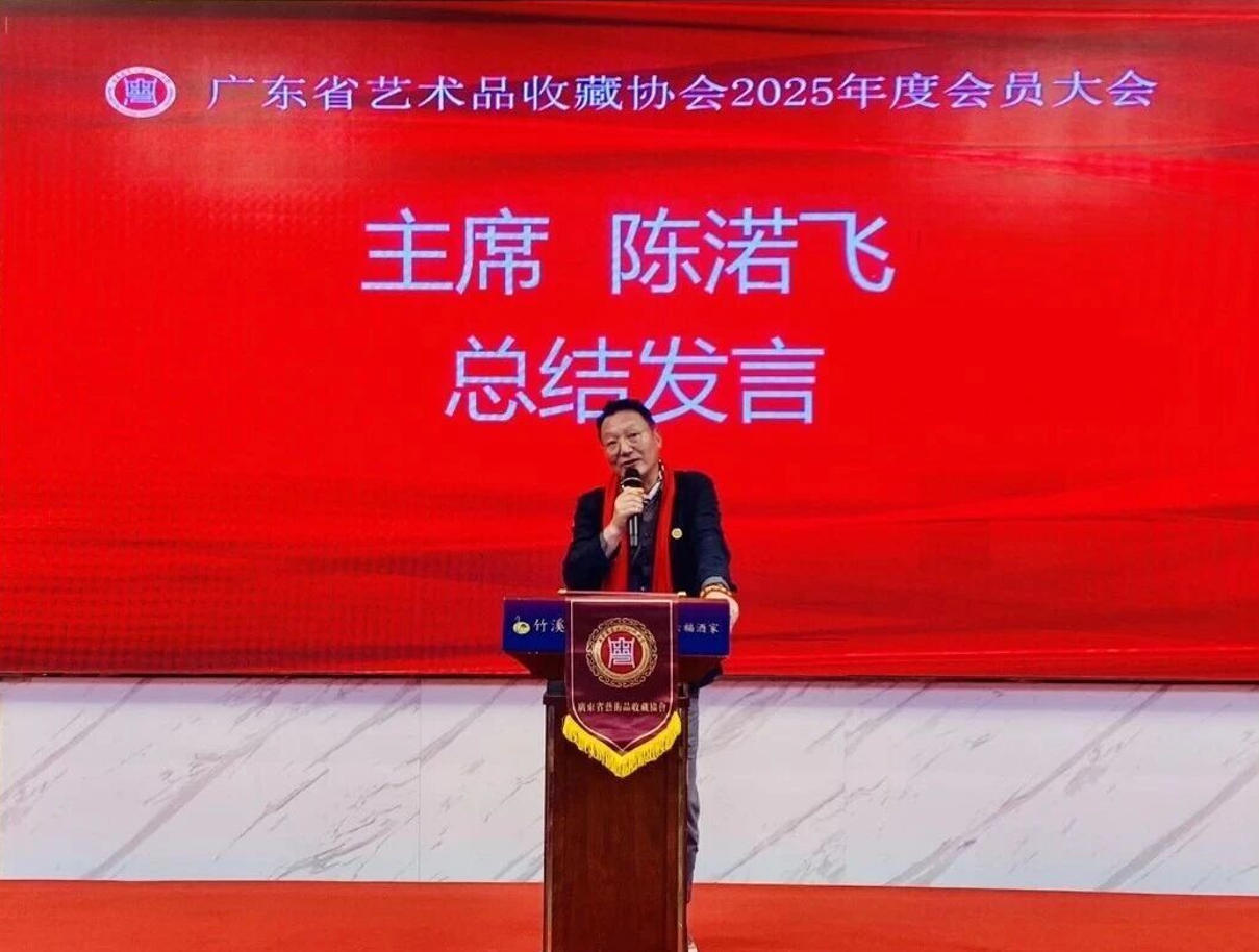 广东省艺术品收藏协会主席陈渃飞在总结发言中,充分肯定了第二届协会班子在短时间内取得的显著成绩。他指出,未来协会将顺应时代发展,持续提升服务能力:一是健全鉴定、认证、保管及流通运营体系,开展专题培训与藏品研究,推动藏品资源“活起来”;二是着力打造粤港澳大湾区收藏文化交流平台,逐步开展鉴定评估、主题展览、拍卖交易等活动,助力会员实现藏品价值与流通;三是积极推动协会艺术馆建设,打造一个服务会员、面向社会的开放式平台,为藏品展示、艺术普及与文化互动拓展新空间。