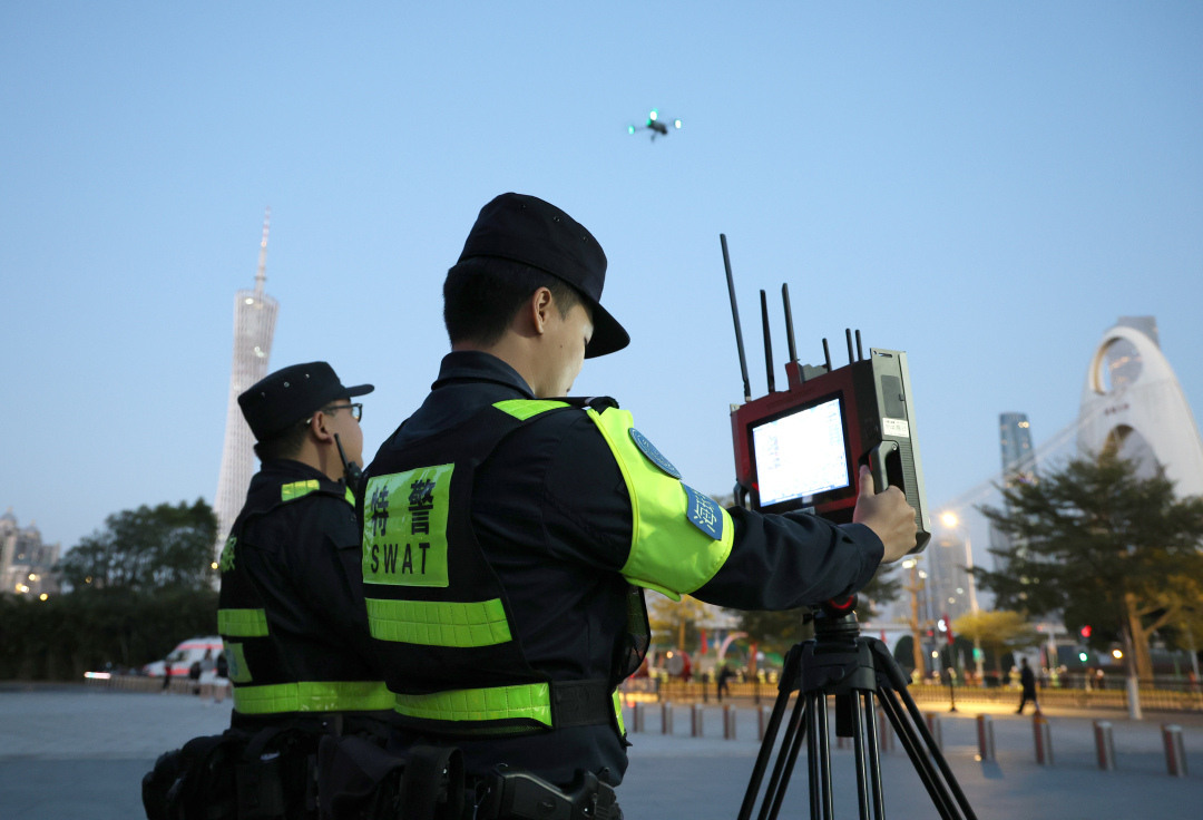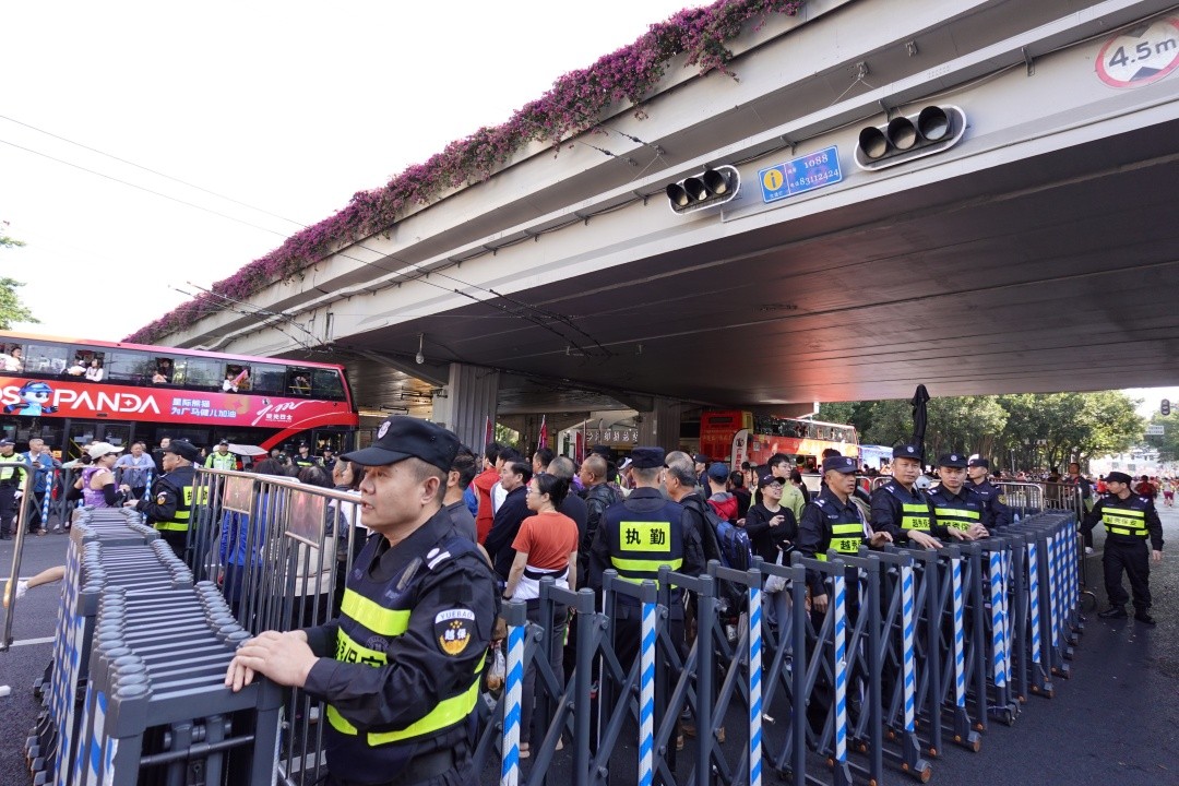 交通与空域防控方面,广州警方在冼村路、猎德大桥北端、沿江西路等5条单向封闭赛道一侧设置“防撞水马+警车”双层防护屏障,并对重点道路实施双向封控;在运动员队伍后方配置1辆警车,在汽车巡游队伍后方部署3辆警车及摩托车,强化压尾解封与动态防控,筑牢立体安全防线。赛事期间,累计摆放交通设施5800余件,排查整改赛事沿线信号灯路口217个,在起终点、重点路口等关键部位部署无人机反制设备,全面织密交通防护网与空域安全防线。