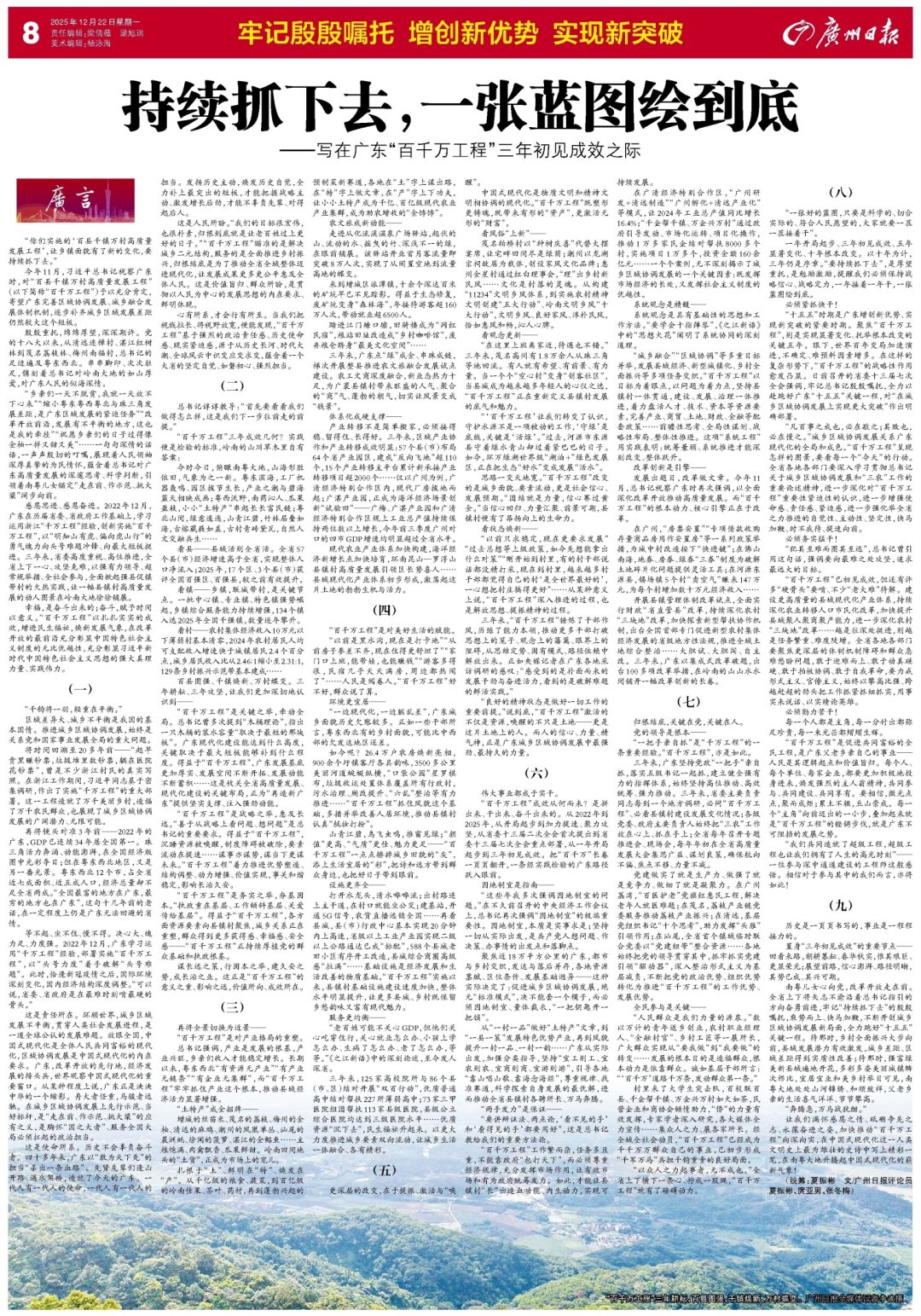 “百千万工程”成效从何而来?是拼出来、干出来、奋斗出来的。从2022年到2025年,从开局起步到加力提速、聚力攻坚,从省委十三届二次全会首次提出到省委十三届七次全会重点部署,从一年开局起步到三年初见成效,把“百千万”长卷一页页翻开,一条经实践检验的广东路径跃入眼前。