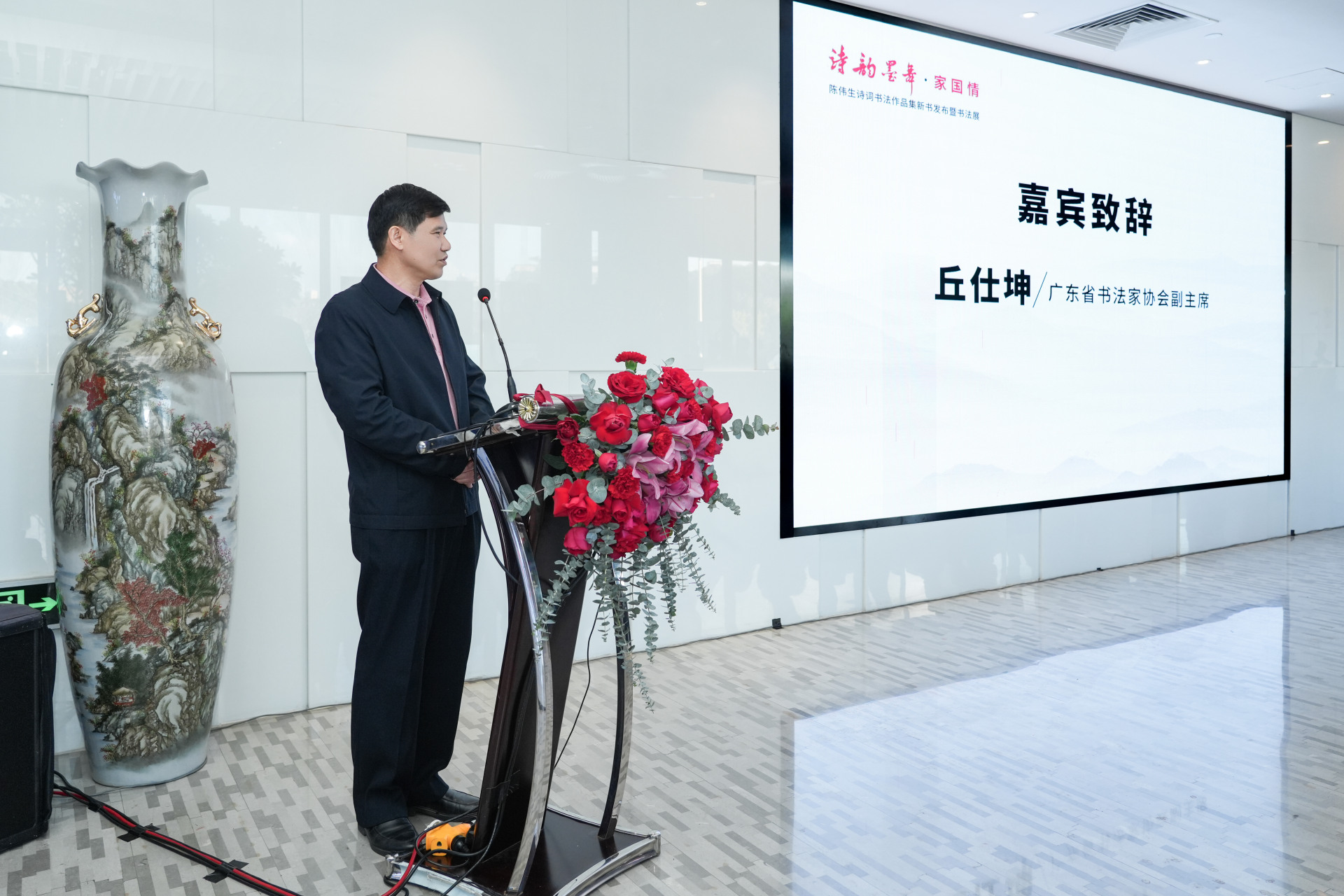 中国书法家协会理事、广东省书法家协会副主席丘仕坤在发言中指出,陈伟生先生是岭南书界一位诗书合璧、德艺双馨的佼佼者。他文武兼备,始终扎根于中华优秀传统文化的丰厚土壤,潜心钻研,孜孜以求,成果丰硕。今天首发面世的这部诗书相融的作品集和展览,不仅是他个人艺术生涯的阶段性总结,更是南粤书法家在传承诗书文化之路上的有益探索和成果展示,综观陈伟生先生的作品,主要体现三个维度的深度融合:第一,是“诗心”与“书意”的深度化融合。 中国艺术向来崇尚“诗书画印”一体同辉,其中“诗”与“书”的联姻,尤为源远流长。陈伟生先生的可贵之处在于,他并非简单地将诗词作为书写的文字内容,而是以一位诗人的情怀去感知世界,再以一位书家的笔墨去抒发性灵,达到了内容与形式、情感与笔墨的高度统一。第二,是“家国”与“情怀”的主题化融合。“家国情”是本次展览的主题,更是贯穿陈伟生先生艺术创作的精神主线,笔墨与时代同频共振,与人民情感相通。第三,是“守正”与“出新”的创造性融合。 陈伟生先生在深厚传统中汲取养分,他对古典书法的法度,尤其是对“二王”碑帖的深入研习,体现了“守正”的根基之牢。然而,他的作品又绝不泥古,而是在笔法、结体、章法乃至审美意境上,融入了自身对时代的理解与个性化的艺术语言,展现出“出新”的勇气与才情。这种“以古人之规矩,开自己之生面”的实践,正是推动书法艺术创造性转化、创新性发展的生动例证,为岭南书界提供了有益的启迪。他的艺术实践启示我们,真正的书法艺术不止于技法锤炼,更在于精神承载与文化传承。他以笔墨为桥,连接古意与今情,让书法在当代持续焕发感动人心的力量。