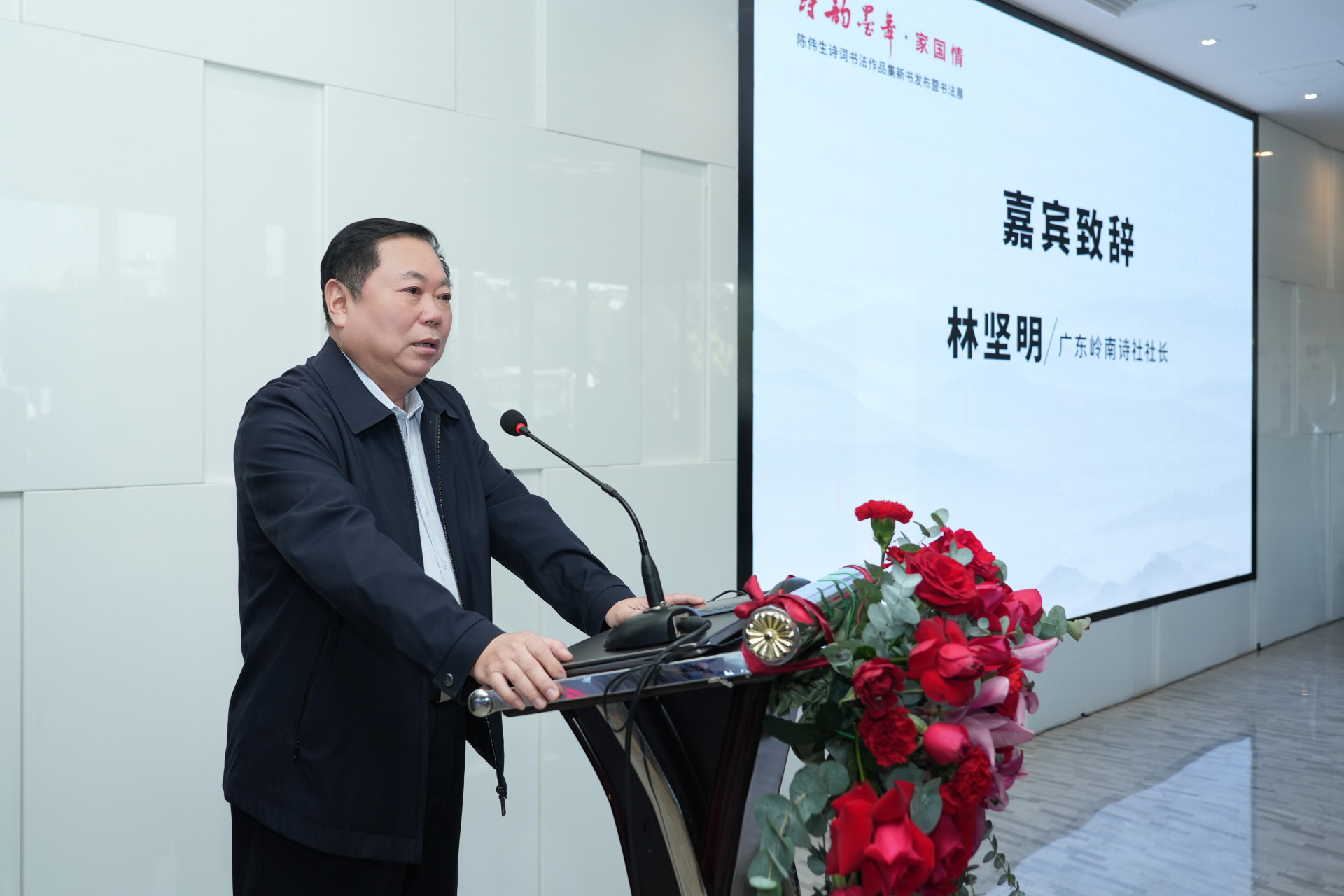 广东岭南诗社社长林坚明在致辞中指出,陈伟生先生勤耕不辍、德艺双馨,深耕岭南文艺园地数十载,始终以笔墨为桥、以诗词为媒,扎根生活、心系家国。这部《诗韵墨舞·家国情》,既是他艺术生涯的深情总结,更是新时代文人情怀的生动写照。集百首诗词,皆以家国为魂、时代为脉,或咏壮丽山河、或抒人民情怀、或赞民族复兴,字字句句饱含赤子之心,尽显家国担当;百幅墨宝则以隶、楷、行、草四种书体挥洒而就,将古典诗词的格律之美与书法艺术的线条之韵完美交融,既见传统功底之深厚,又含创新探索之锐气,真正实现了“诗情”与“墨韵”的共生共辉。这不仅是陈伟生先生个人艺术成就的集中展示,更是岭南当代书画艺术“守正创新”的精彩缩影。