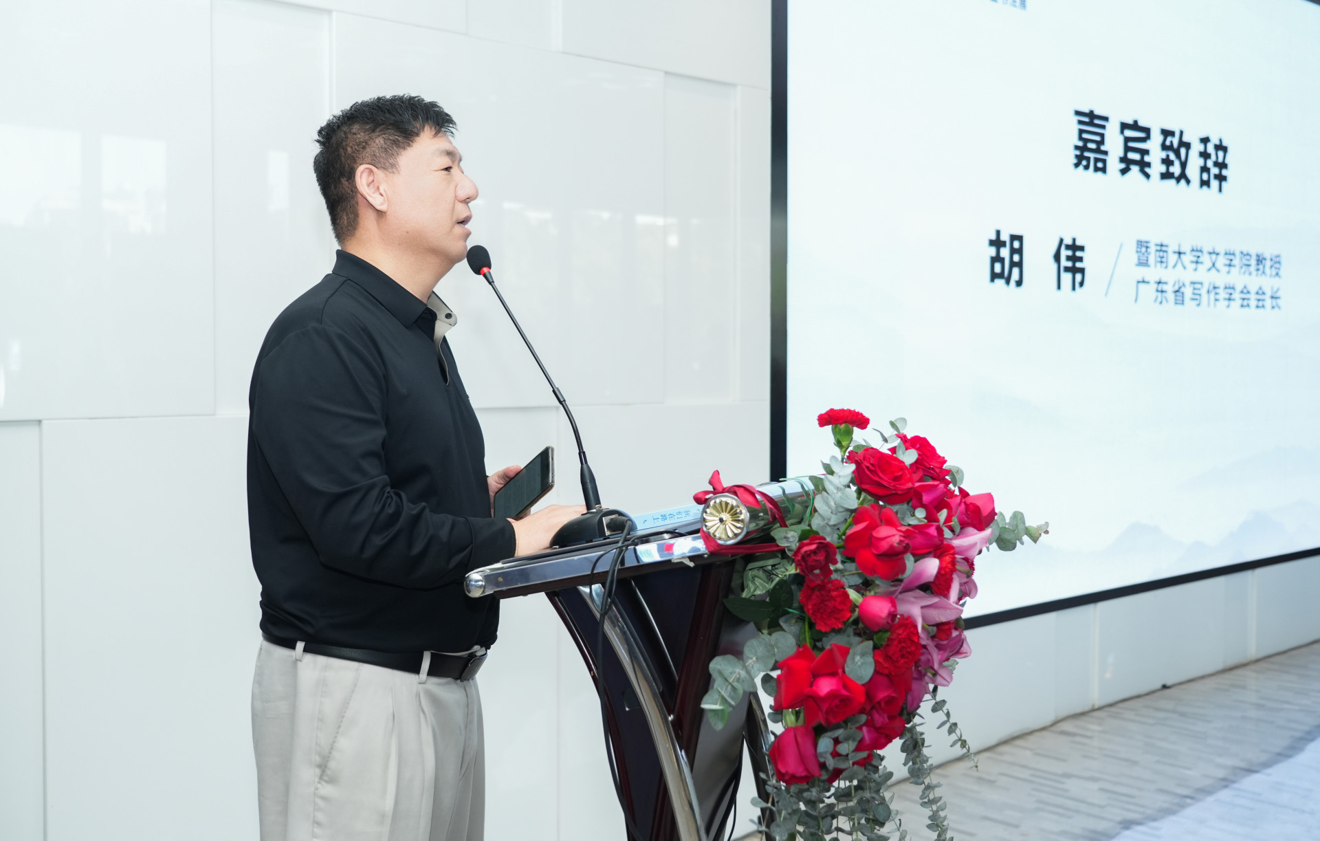 广东省写作学会会长胡伟在致辞中说,陈伟生诗词书法展为我们奏响了一曲“诗书合璧、家国同春”的华彩乐章,这既是他个人艺术生涯的丰碑,也是奉献给广东文化界的一份独特的礼物。他为我们呈现了一场关于“写作”的叙事和美学实践,令人深受启发,感慨良多,第一点启发,在于他向我们展示了“写作”作为生命表达的深度与广度。陈伟生的诗词,是他对社会的敏锐观察与深情书写;他的书法,则是将这份情感与思考,通过笔墨的韵律、线条的舞动,进行了一次视觉化的的“再写作”。第二点共鸣,在于他的实践与我们学会倡导的“写作+”理念不谋而合,《诗韵墨舞·家国情》,正是“写作+”的很好的范例。第三点展望,在于他的探索为我们思考写作的当代使命提供了借鉴,当代的写作,无论形式如何变化,其核心使命依然是“以文化人,以文兴业”,书写最真挚的中国故事,为个人立传,为时代发声。