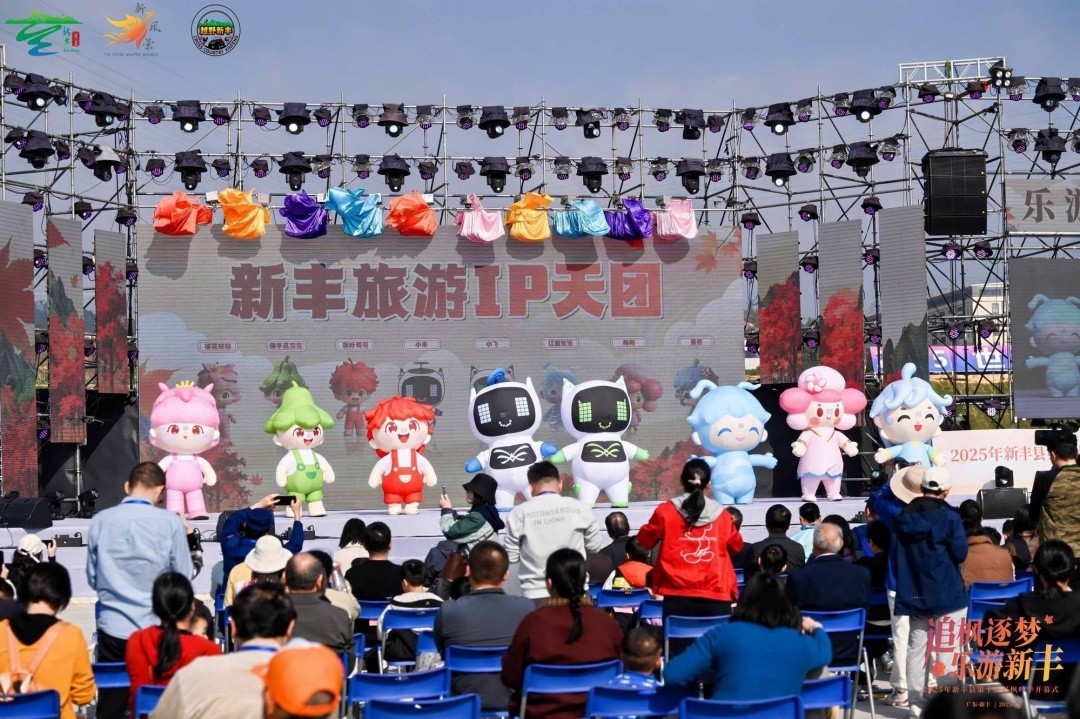 铿锵鼓点划破山林静谧,潮汕英歌舞率先登场,刚劲舞姿与漫山红枫相映成景,非遗活力与自然胜景碰撞出炽热火花。紧随其后,新丰旅游IP天团亮相:“枫叶哥哥”“樱花妹妹”“佛手瓜宝宝”“江源宝宝”“梅梅”“泉泉”六大本土特色形象,携手新丰低空经济代言人“丰飞侠-小丰、小飞”,8个萌趣IP组团出道,成为新丰文旅最鲜活的“形象大使”。专为低空经济量身打造的主题歌曲《丰飞侠》同步首唱,轻快旋律中满是新丰文旅创新突围的活力与底气。