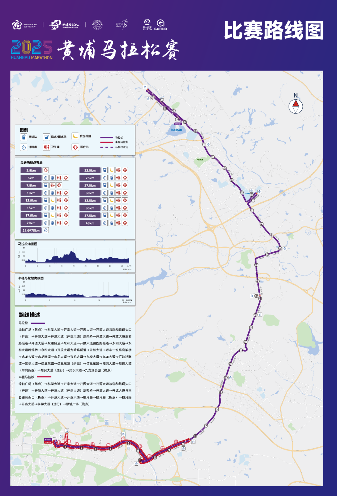 比赛起点设在科学城绿轴广场,马拉松终点设在中新广州知识城九龙湖广场;半程马拉松终点设在科学城绿轴广场。