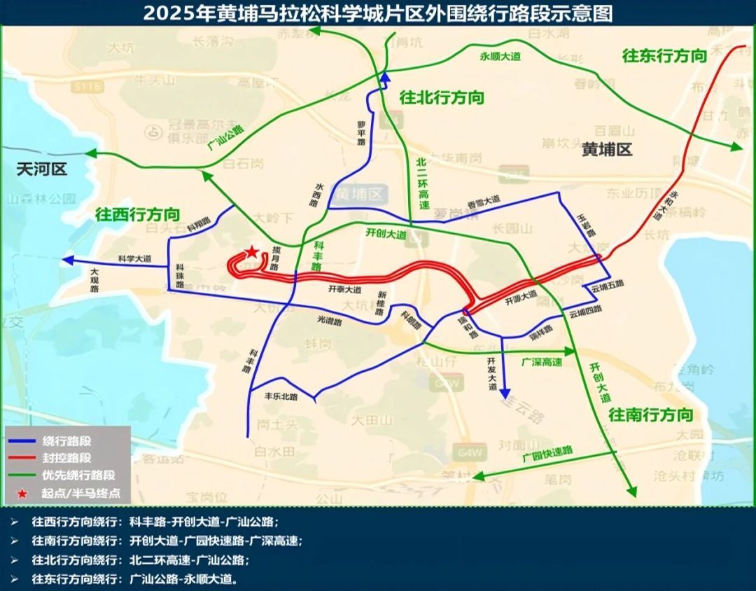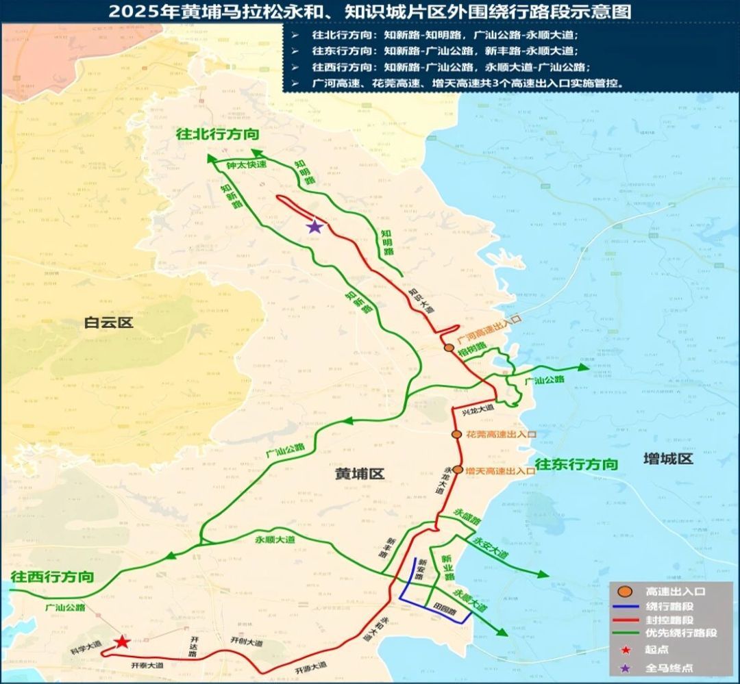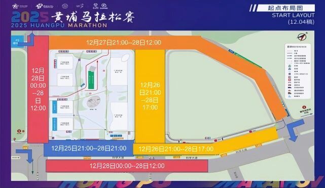 ◼︎下列时间、道路除持有2025黄埔马拉松赛专用车证的车辆和执行紧急任务的军警车、消防车、医疗救护车、工程抢险车外,禁止其他车辆通行。