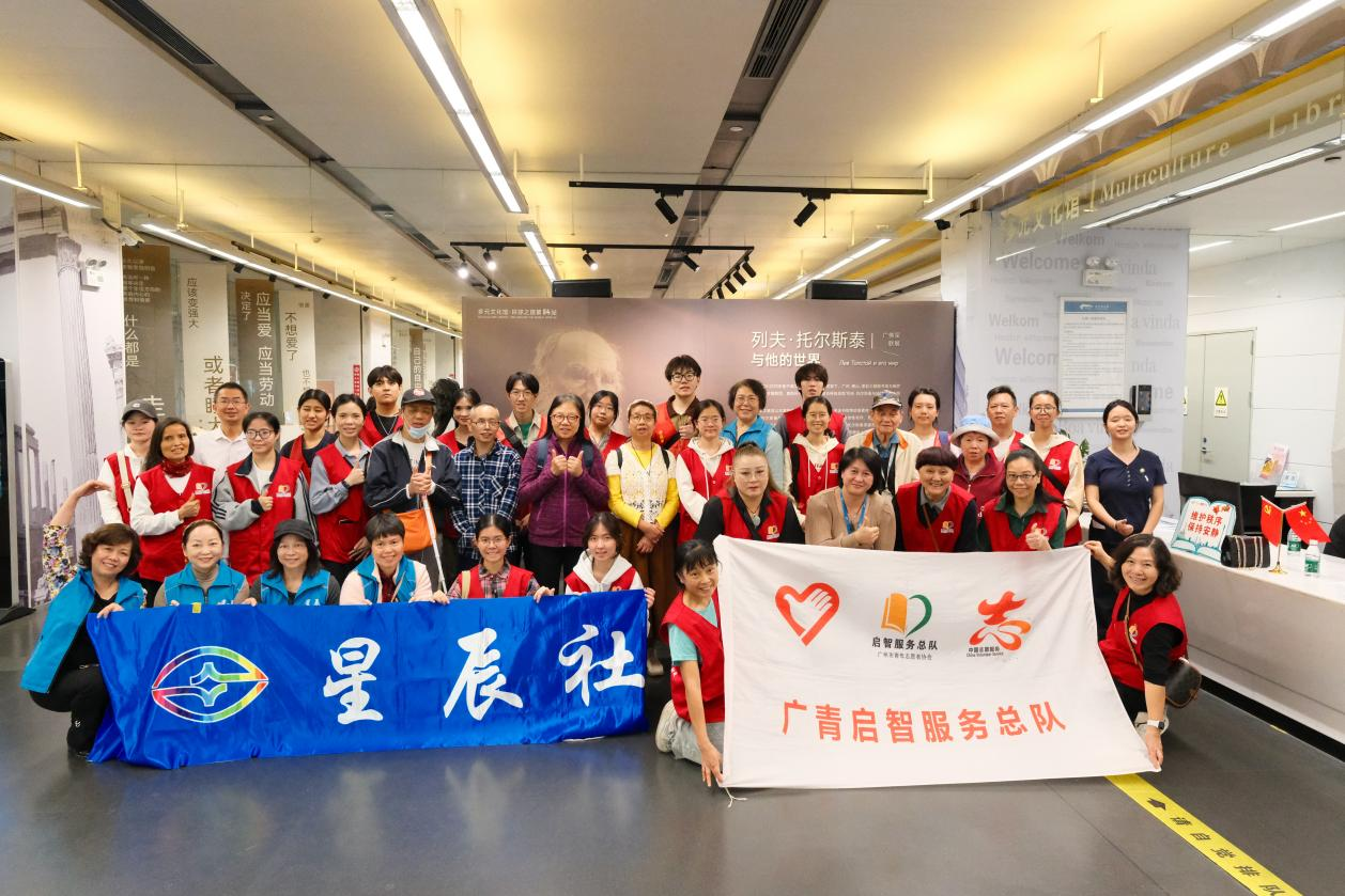 12月21日下午3点,广州图书馆北八楼多元文化馆内,一场特别的展览导赏活动如期举行。与往常不同的是,现场的视障读者在志愿者的声音引导下,正“沉浸式”地走进文学巨匠列夫·托尔斯泰波澜壮阔的世界。这是广州图书馆为回应视障读者群体的热切期盼,联合星辰社特别策划的“口述影像——列夫·托尔斯泰展览”专场活动。活动中,前往地铁迎接报名的视障读者的服务由广青启智提供支持。