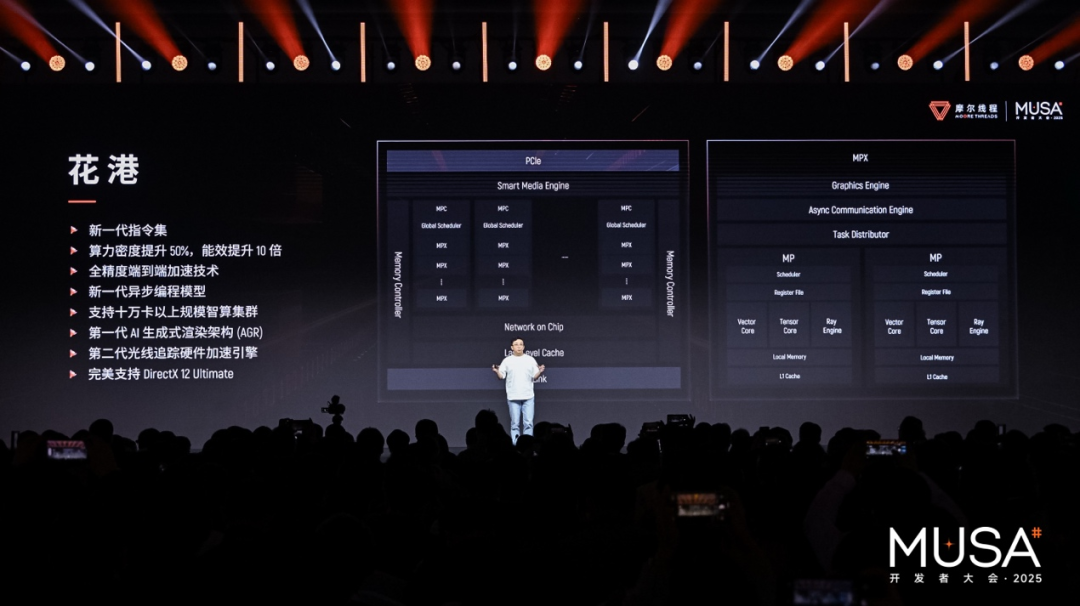 刚过去的这个周末,北京中关村国际创新中心,带着“国产GPU第一股”的光环,摩尔线程举行了上市后的第一次重大活动:首届MUSA开发者大会。大会上,摩尔线程一下子拿出了新架构“花港”、夸娥万卡智算集群、全新个人智算平台、硬件级光线追踪加速、突破1000 tokens/s的推理性能等一系列技术,并发布了超节点架构以及图形进化方面的未来规划。