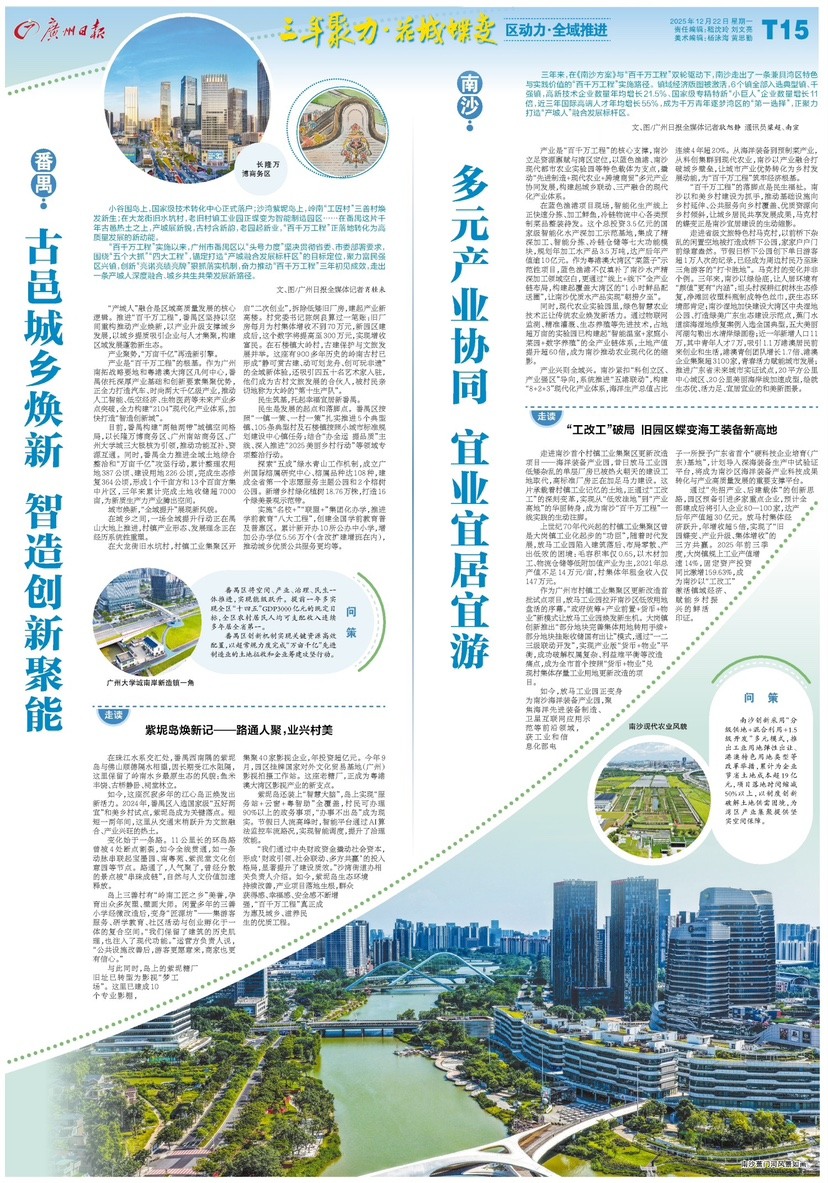 小谷围岛上,国家级技术转化中心正式落户;沙湾紫坭岛上,岭南“工匠村”三善村焕发新生;在大龙街旧水坑村,老旧村镇工业园正蝶变为智能制造园区……