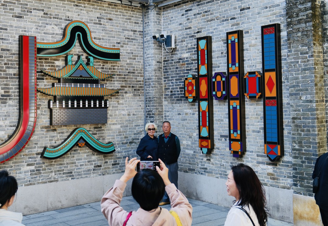 记者在现场看到,墙上的“广州”二字格外吸睛,轮廓勾勒成岭南古建筑镬耳屋的造型,笔画间嵌着满洲窗的多彩纹样,色彩丰富而又风格活泼的字体,为灰色的墙面增添了不少活力。来自吉林的游客王女士,带着父母来永庆坊游玩。参观完粤剧艺术博物馆后,她们一眼就看到了这面“广州”打卡墙。“这面墙很有趣!拍个照发个朋友圈,朋友们就知道我们来广州玩了。”