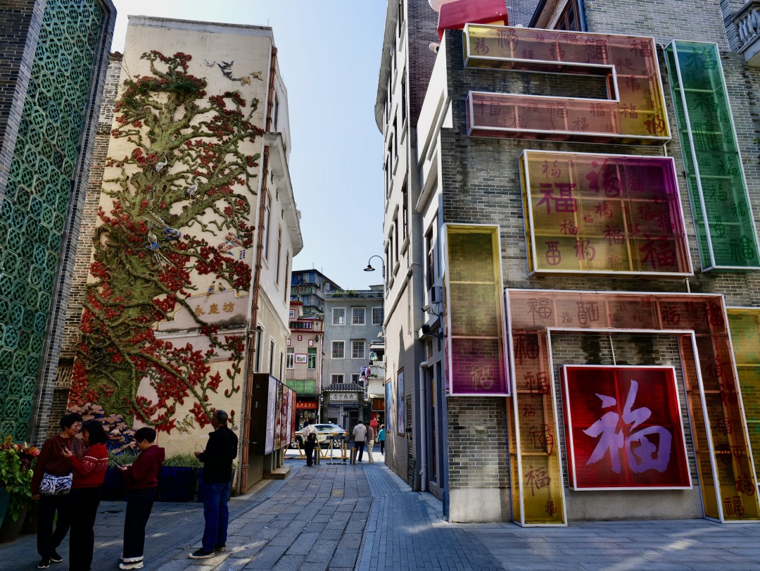 作为广州老城“微改造”的标杆,永庆坊里保留了大量传统民居和文物保护单位,承载着西关老城几代人的记忆。距离“广州”打卡墙不远处,永庆坊的标志性景观木棉灰塑墙和百福墙同样大有来头。据悉,这面木棉灰塑墙是由“广东好人”、国家级非物质文化遗产(广州灰塑)代表性传承人邵成村操刀的作品,以传统灰塑工艺塑造出盛放的广州市花木棉花。红花与灰墙相映成趣,结合旁边的“福”字艺术墙与“广州”墙,更是形成文化呼应。