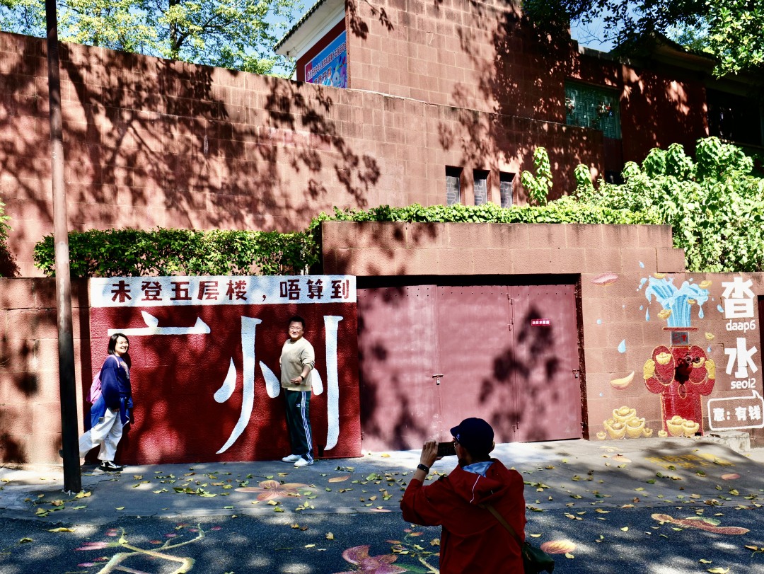 而在镇海楼红墙上,写有“广州”二字的打卡墙藏着有趣的设计:“广”少一撇、“州”少一竖。正是因为“缺笔少划”的设计,为游客打卡拍照时增添了不少欢乐。值得一提的是,打卡墙前还有大幅木棉彩绘,而另一侧则写着“沓水”二字,寓意“有钱”。拍照时,不少游客特意将“广州”与“沓水”同框,讨个好彩头。
