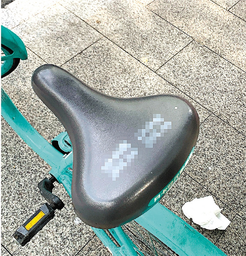 在一些集中停放共享自行车的地方,上述“牛皮癣”较容易被观察到。比如在越秀区仓边路与东风路交界的人行天桥底,部分共享自行车的坐垫上,被白漆喷上了不良网站的小广告。在海珠区客村地铁站出口,部分共享自行车的坐垫也被喷了小广告。在天河区天河北路天河体育中心出入口处,部分共享自行车也存在上述情况。