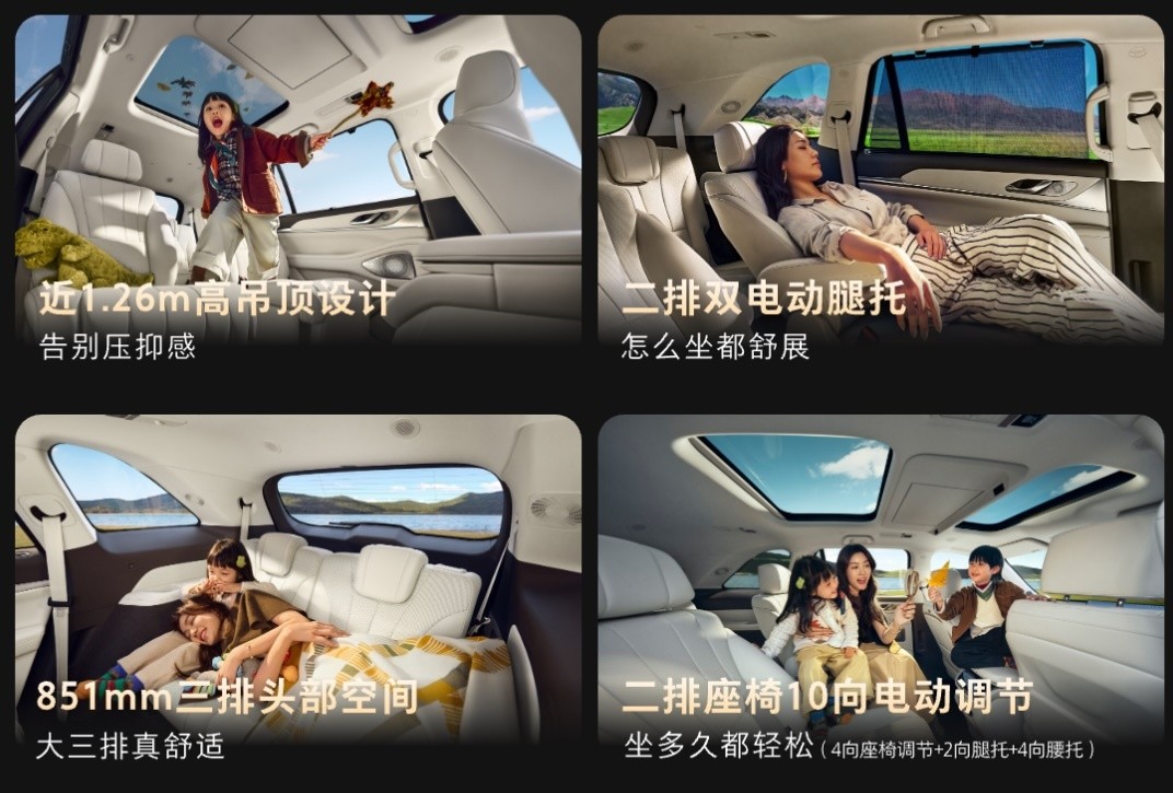 新车坚守“车内无主次之分”的设计理念,打造全员宽适的大六座空间。近1.26m高吊顶设计告别压抑感,二排配备双电动腿托与10向电动调节功能,三排拥有851mm头部空间与“4向座椅调节+2向腿托+4向腰托”的舒适配置,即便成人也能坐卧自如。主驾配备八点按摩功能,副驾全系标配零重力座椅,支持12向电动调节、通风加热与8点按摩,带来SPA级出行体验。