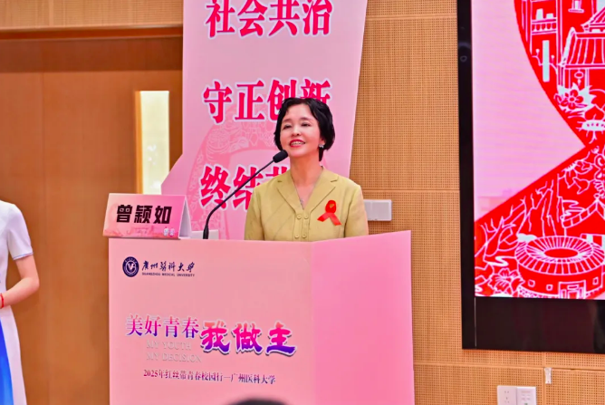 广州医科大学党委书记曾颖如表示,作为一所以医学为优势和特色的国家“双一流”建设高校,广医高度重视青年学生健康成长,通过开设《大学生心理健康教育》课程、组建“青春红丝带”志愿宣讲团、开展防艾论坛剧场、组织青春健康讲师赛等多种形式,引导学生树立科学的健康观念。她亲切寄语全体同学用专业和同理心去关爱他人、保护自己,将红丝带象征的爱心与责任不断传递下去,共同为实现终结艾滋病流行的目标贡献力量。