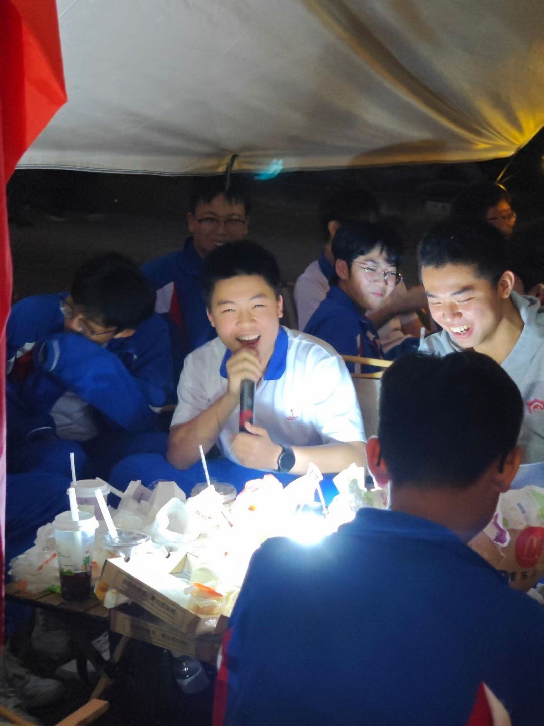 当日色晕染出静谧蓝调,夜幕正式降临,露营地的欢乐氛围也推向高潮。“青春欢歌会”在各个天幕下同步开启,从《晴天》的青涩怅然到《成都》的温柔缱绻,再到《可可托海的牧羊人》的深情婉转,平日里深藏不露的“校园歌神”们纷纷亮嗓,熟悉的旋律引发阵阵大合唱,歌声里有少年人的意气风发,也有同伴间的灵魂共鸣。另一边,三五成群的同学围坐玩起桌游,在思维的碰撞中收获快乐;还有人漫步在露营地周边,借着星光观察树影婆娑,在低声畅谈中拉近心灵距离——这是属于少年人的闲适时光,更是学业压力下的一次有效松弛,让大家在纯粹的互动中滋养友谊、释放自我。
