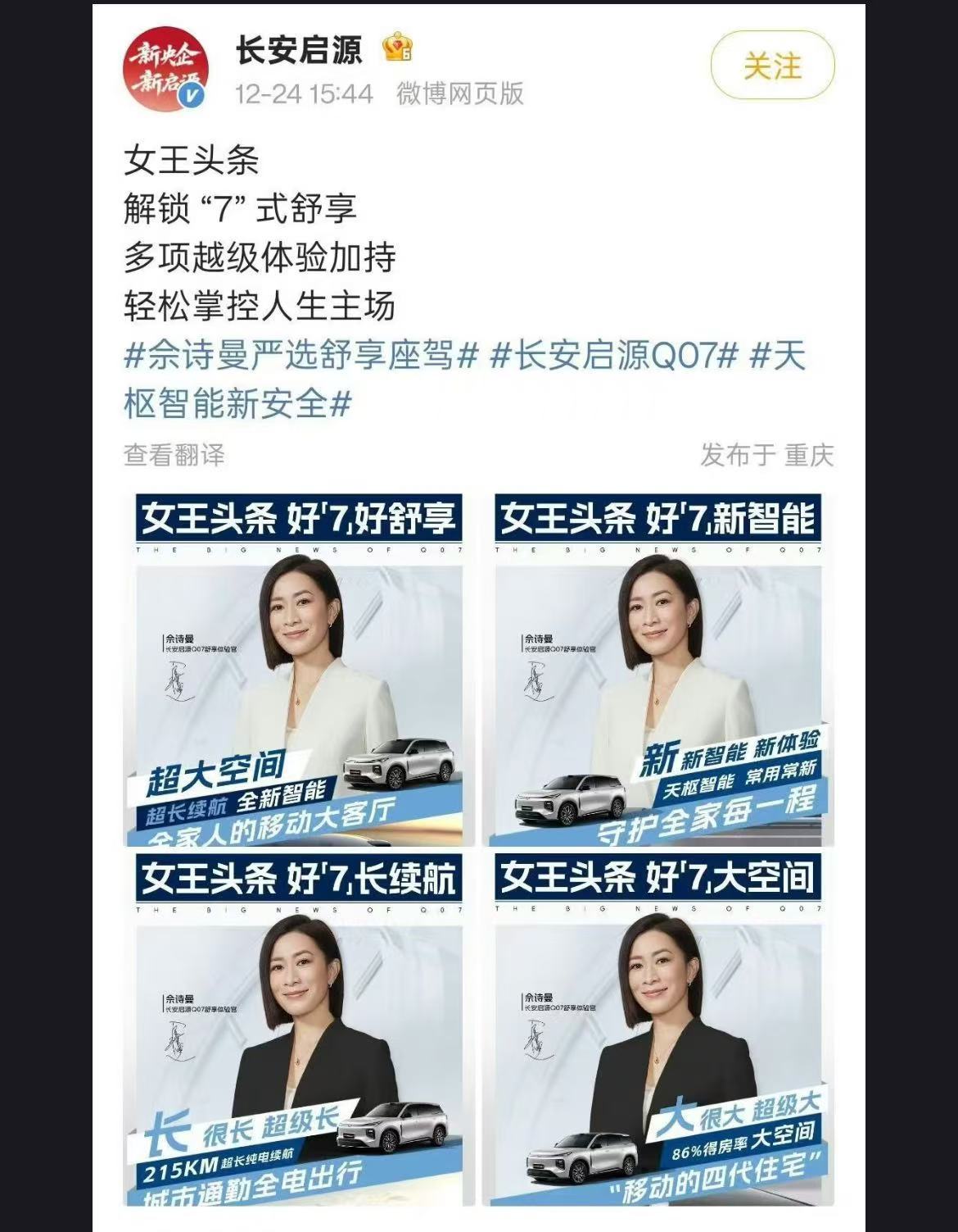 昨日,汽车品牌长安启源在官方微博发布了一系列旗下Q07车型的宣传海报,海报以“好7好舒享”“好7新智能”等口号,意在突出车辆在舒适性与智能化方面的卖点。然而,这一营销举措却意外在网络上引发热议。