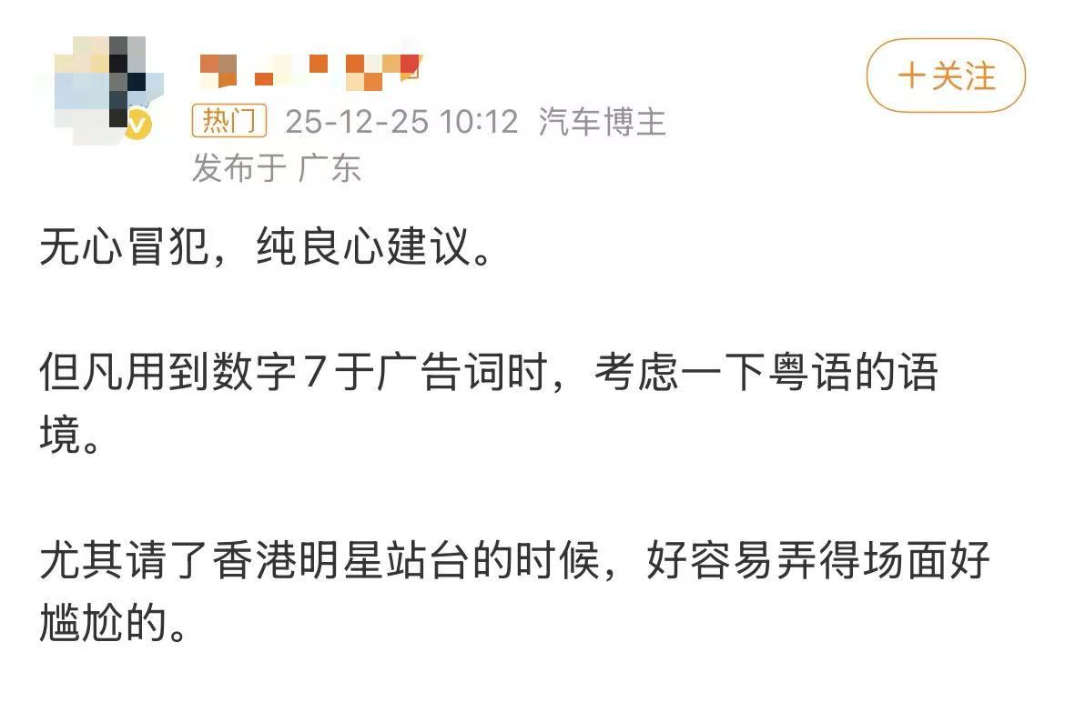 争议焦点集中于口号中的数字“7”。不少来自粤语地区的网友发帖指出,在粤语语境中,“7”因发音与一句粗口相近,通常带有负面、不雅的隐含意义,属于日常交流中需谨慎避讳的词汇。因此,“好7”这一组合在部分网友看来显得颇为尴尬甚至冒犯,纷纷吐槽品牌方“缺乏文化敏感性”“营销翻车”。“还请的是香港明星站台,是不是更要考虑一下粤语语境。”一网友说。