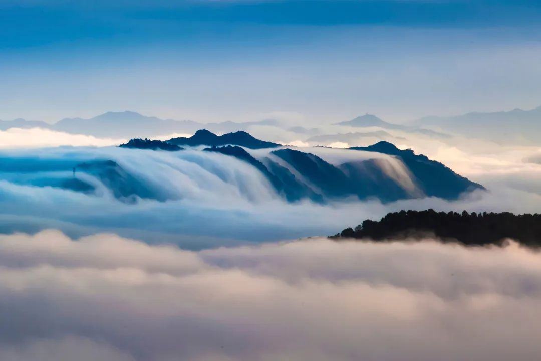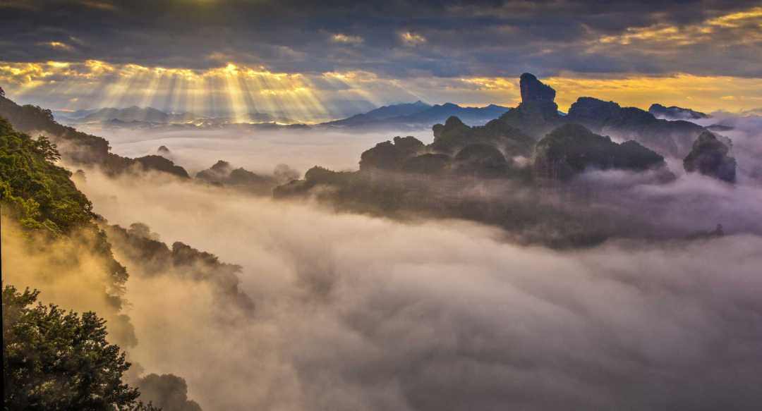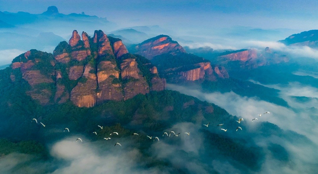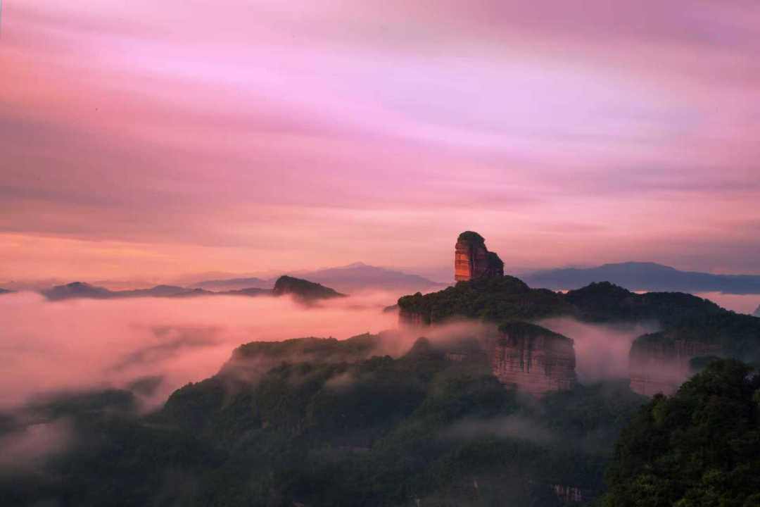 若逢雨霁初晴,丹霞便遁入蓬莱仙境。浩瀚云海从壑底升腾,将硬朗的奇峰裁作江山写意。红色的山巅在乳色流波中若隐若现,宛如孤岛,又似红砂凝成的珊瑚,在轻雾的抚触下,多了一份神秘的庄严与雄奇。