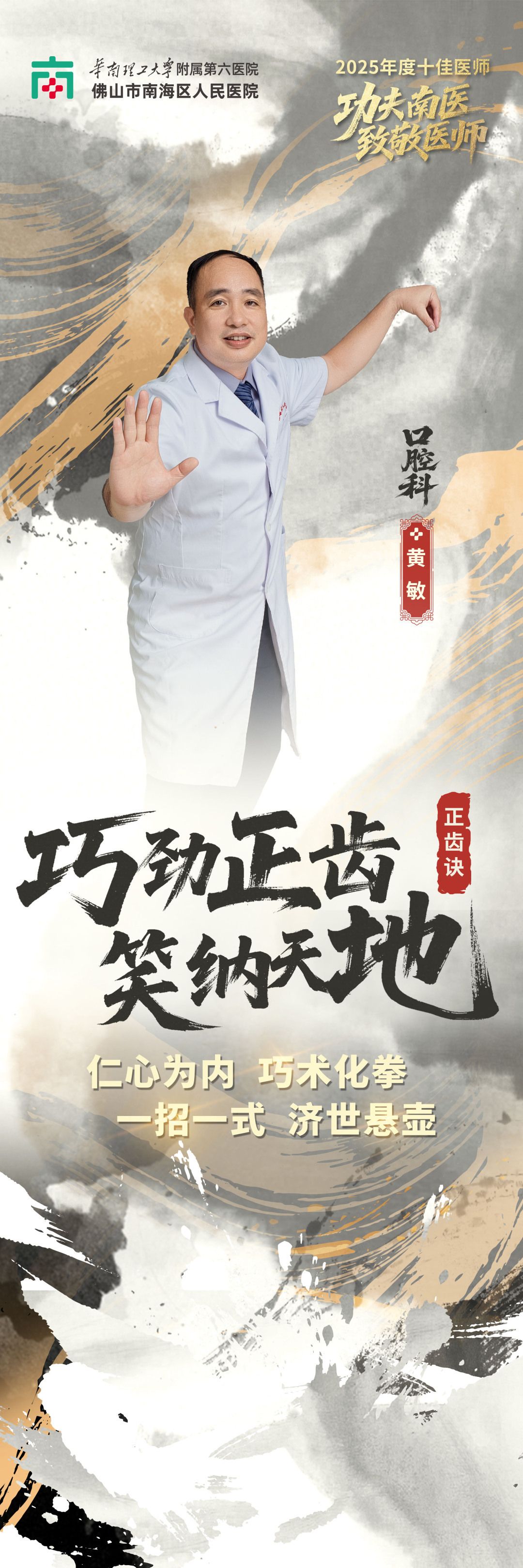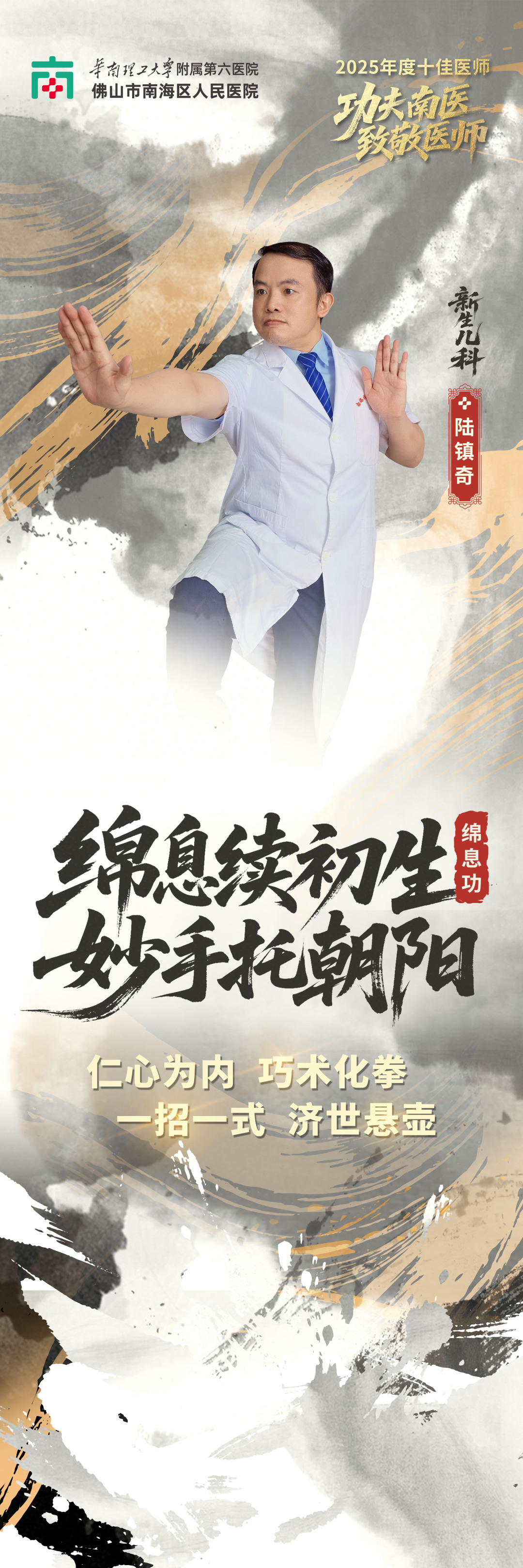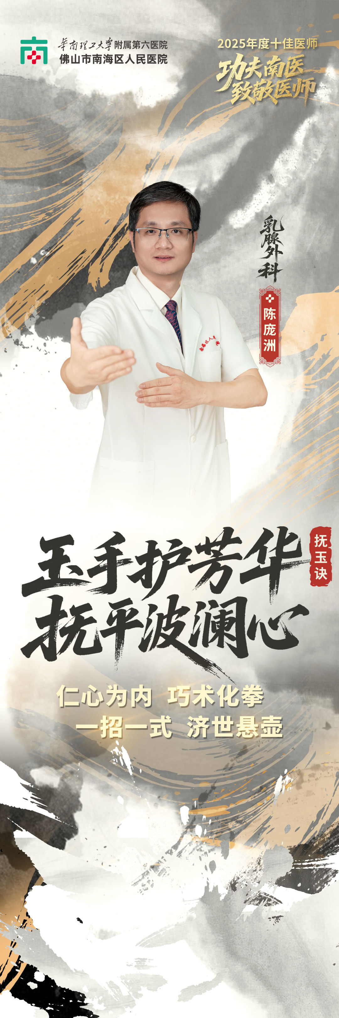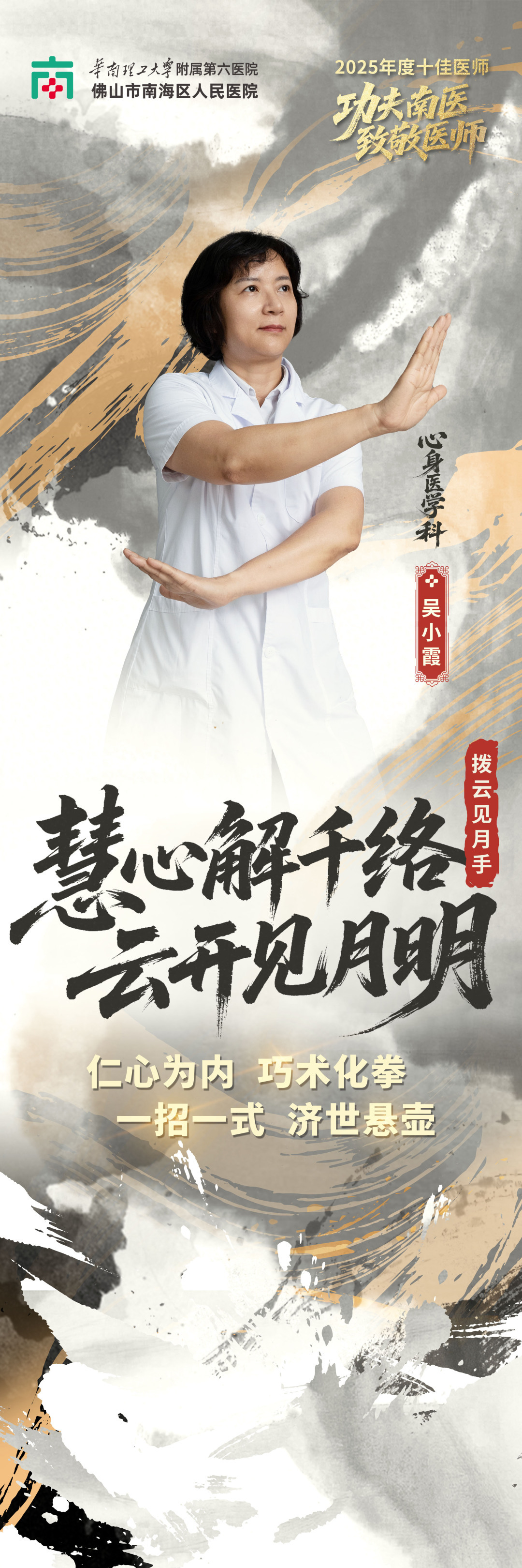 据介绍,这组海报是医院以年度“十佳医师”为主角打造的主题宣传作品,创意根植于医院长期深耕的“功夫南医”文化品牌战略。作为武术之乡,佛山功夫文化中“持之以恒、精益求精、以德为先”的精神,与医院“厚德、精诚、共济、致远”的院训高度契合。恰逢今年医师节“德馨于行,技精于勤”的主题,与功夫“以德立武”“十年磨一剑”的内核一脉相承 —— 武者以精湛武艺立身,医者以过硬医术济世,两者皆以品德为魂、以技艺为本。医院借此将抽象的“医者功夫”视觉化、艺术化,让公众直观感受南医医师精诚专注、守护健康的“侠者”风范。海报的巧思不止于视觉呈现,文案设计精准呼应科室特色,泌尿外科“凝指碎顽石”、乳腺外科 “玉手护芳华”、检验科 “洞微察秋毫” 等,既是对医护人员日常“手上功夫” 的艺术升华,又暗含医者仁心,古韵与专业感兼备。