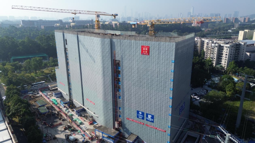 近日,由天河区代建局承建的广东省骨科研究院(长兴院区)项目迎来一个重要的节点——主体结构封顶,这标志着项目建设正式进入机电安装、装饰装修的全新阶段。