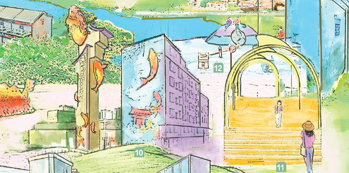《柳色新·云泥焕彩图》中的高明区苏村转运锦鲤文化街区⑩和高明区荷城街道苏村⑪。