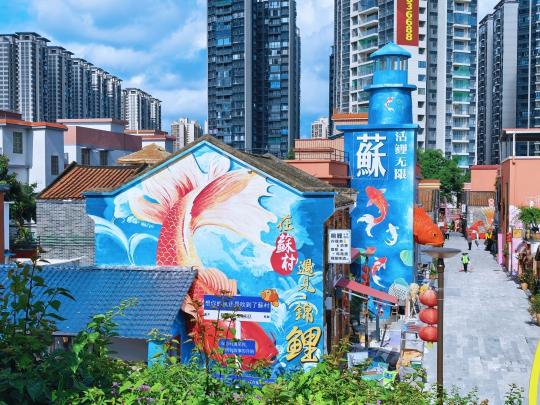不仅如此,高明通过文化赋能,塑造独特IP引流聚气。苏村以“锦鲤文化”IP为核心主线,对村内农房外立面进行统一风貌改造,围绕“一街一主题”理念精心打造了7条特色主题街区。通过视觉焕新与主题营造,将原本普通的乡村空间转变为沉浸式、可消费的文化新场景,成功吸引了大量游客前来“打卡”,为乡村聚集了旺盛人气。