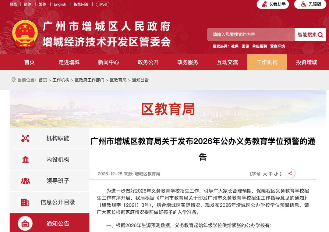12月25日,广州市增城区教育局发布《关于发布2026年公办义务教育学位预警的通告》,涉及23所公办中小学。