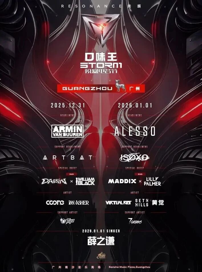 其中2025“湾区音乐汇”重磅活动风暴电音节广州站将于2025年12月31日至2026年1月1日在南沙音乐秀场震撼上演。连续两天的演出将汇聚全球顶尖电音艺人与华语流行顶流,既有亚洲首演的限定联动,也有薛之谦跨界破圈带来惊喜,更有升级舞美与浪漫烟花加持!