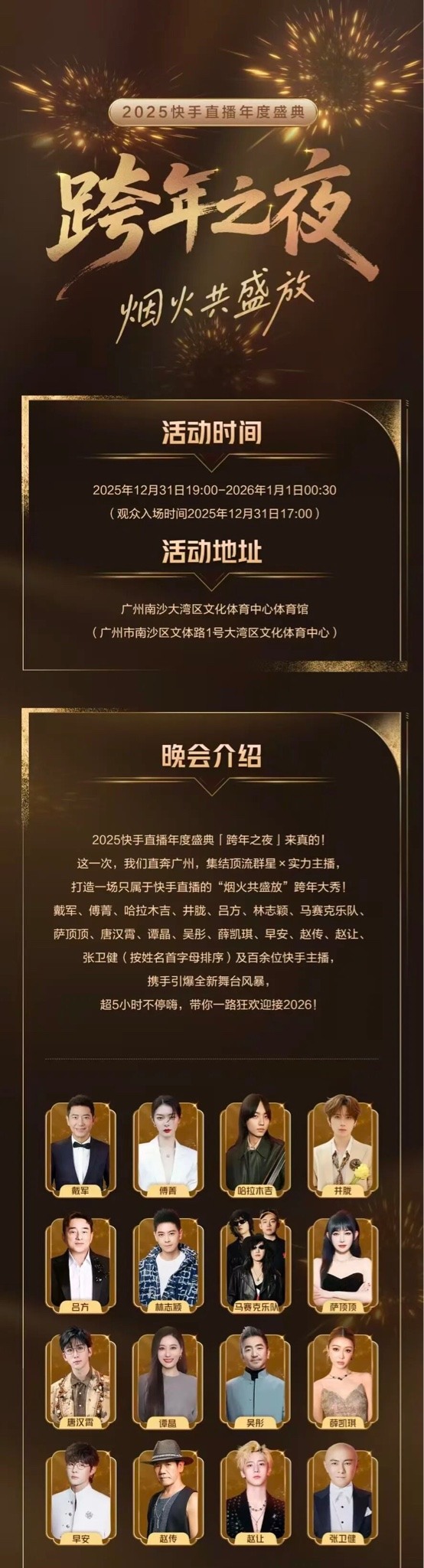 此外,2025快手直播年度盛典“跨年之夜”将落地南沙。12月31日19:00,林志颖、张卫健、薛凯琪等顶流明星将携手百余位实力主播齐聚大湾区文化体育中心体育馆。