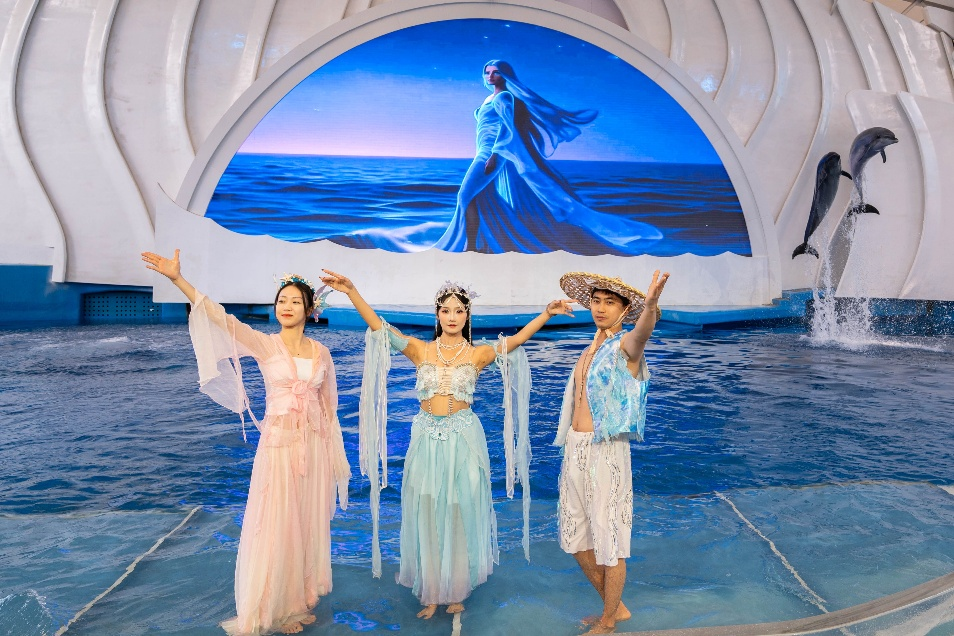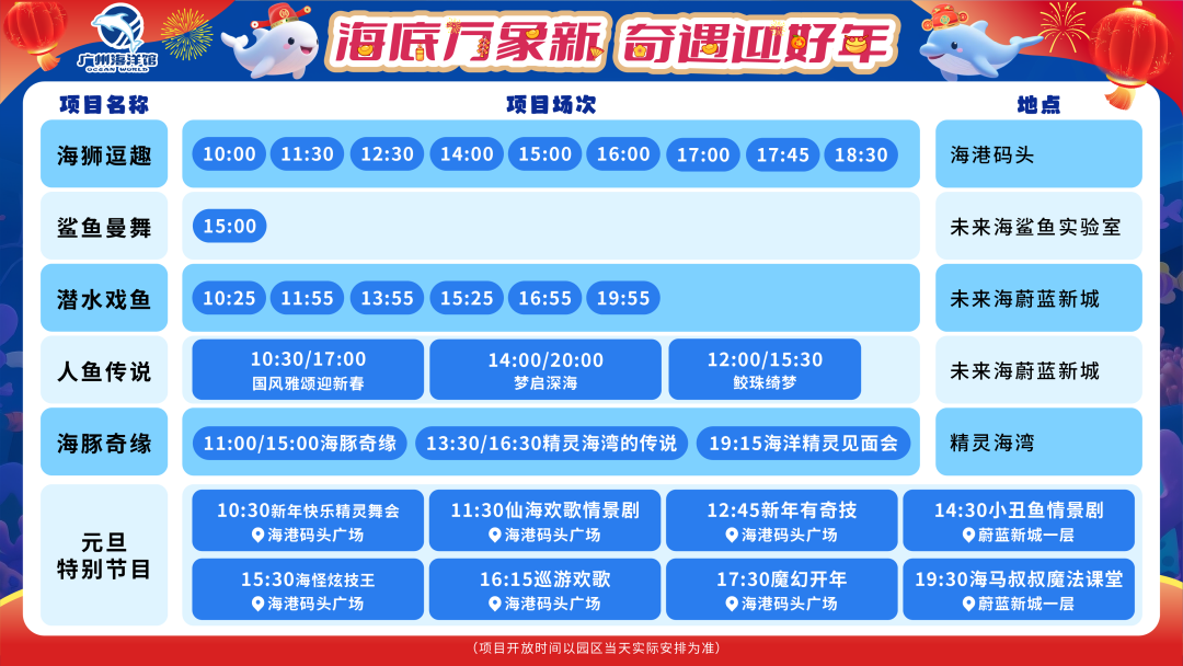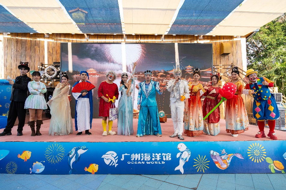 元旦全新主题演艺《广海欢歌》灵感源于备受赞誉的《市井欢歌》情景剧,将国风场景搬入海底世界,演出以趣味穿越剧情,重现古代市井繁华,并融入多样民间艺术。而人气角色“小丑冰冰”也将现身互动,与市民游客共庆新年。