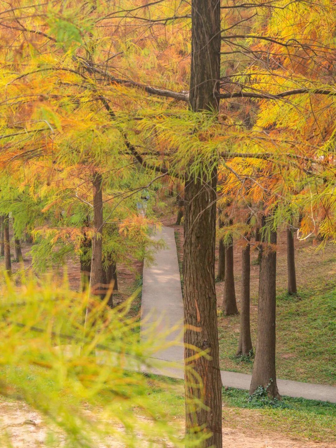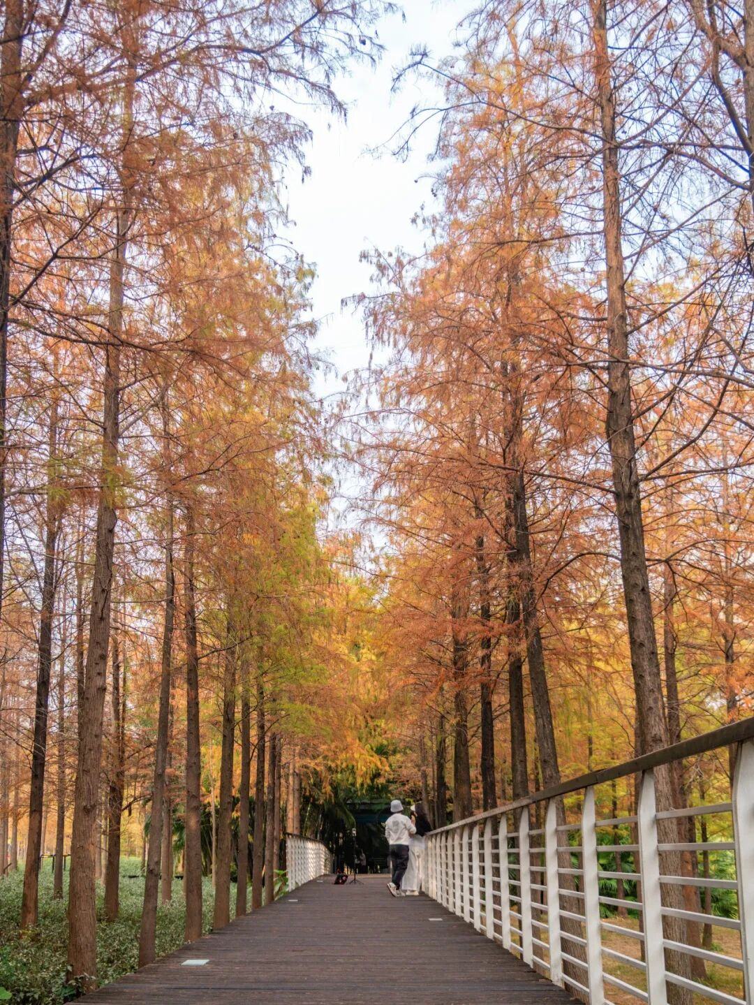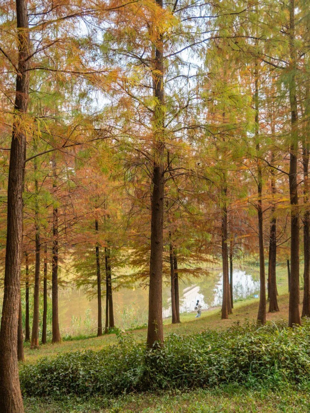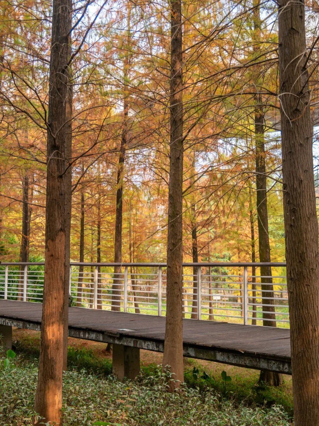 天河大观湿地公园北门附近的这片落羽杉林,地面有坡度,林间分布着池塘,林中架设了木栈道,处处都能拍出极具文艺感的照片。