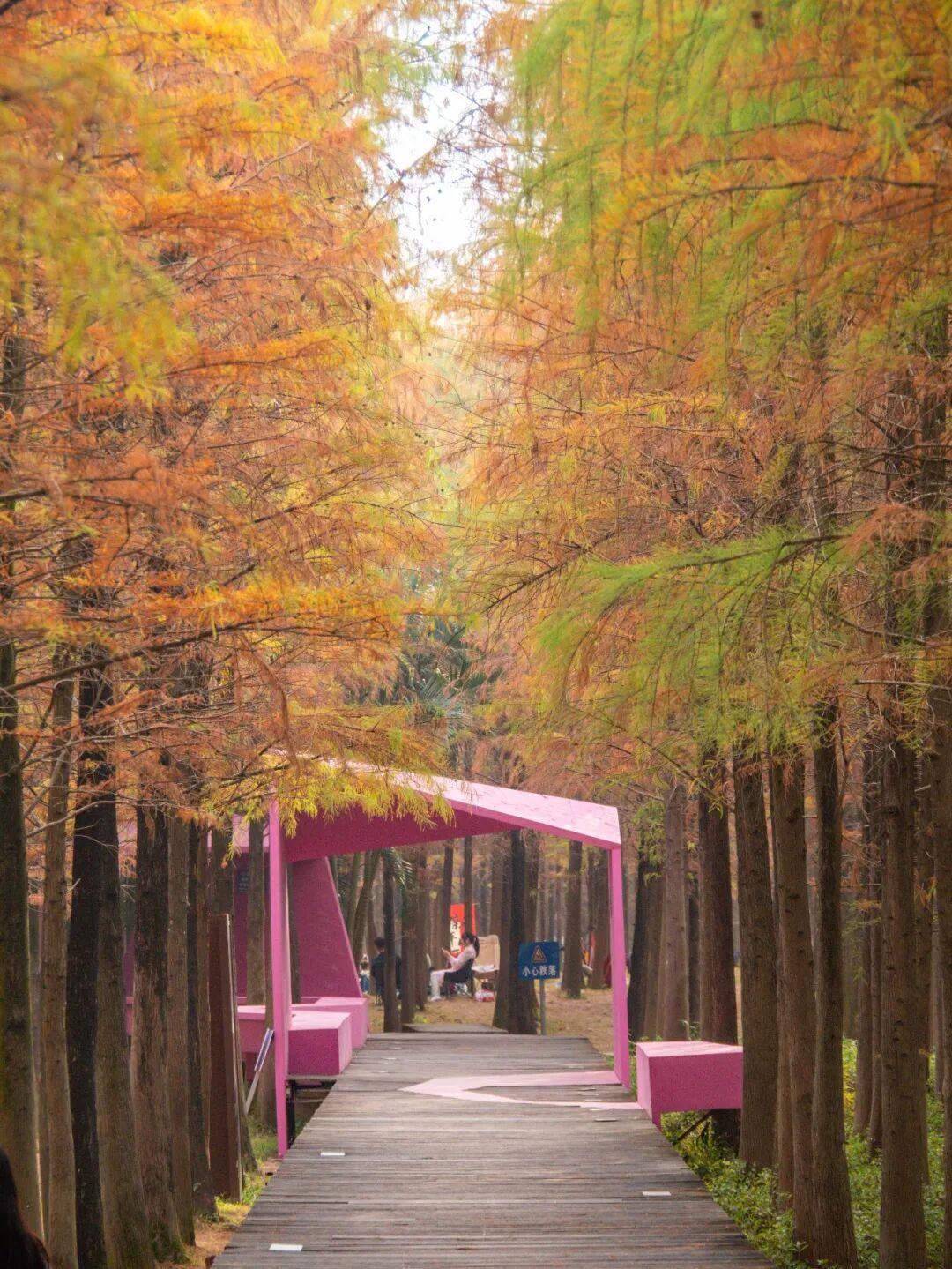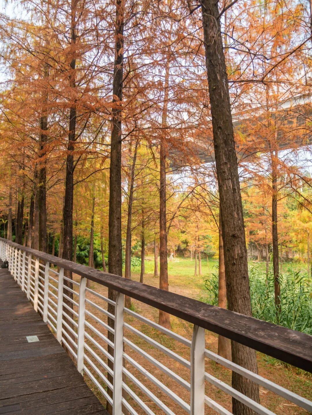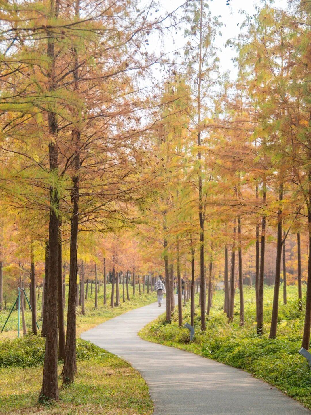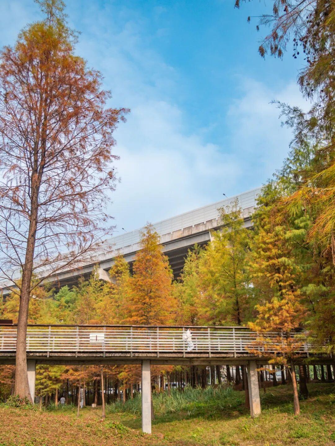 天河大观湿地公园北门附近的这片落羽杉林,地面有坡度,林间分布着池塘,林中架设了木栈道,处处都能拍出极具文艺感的照片。