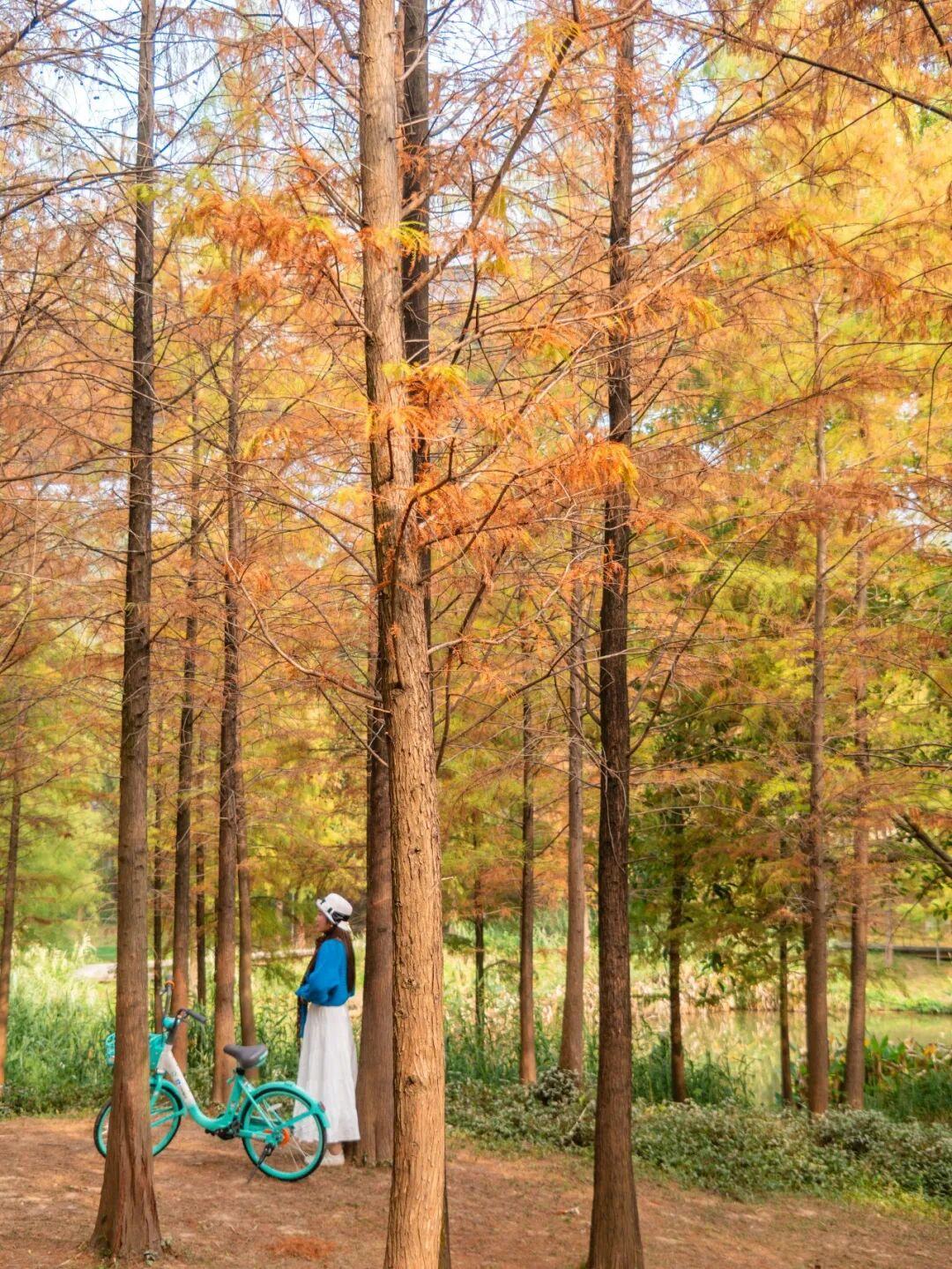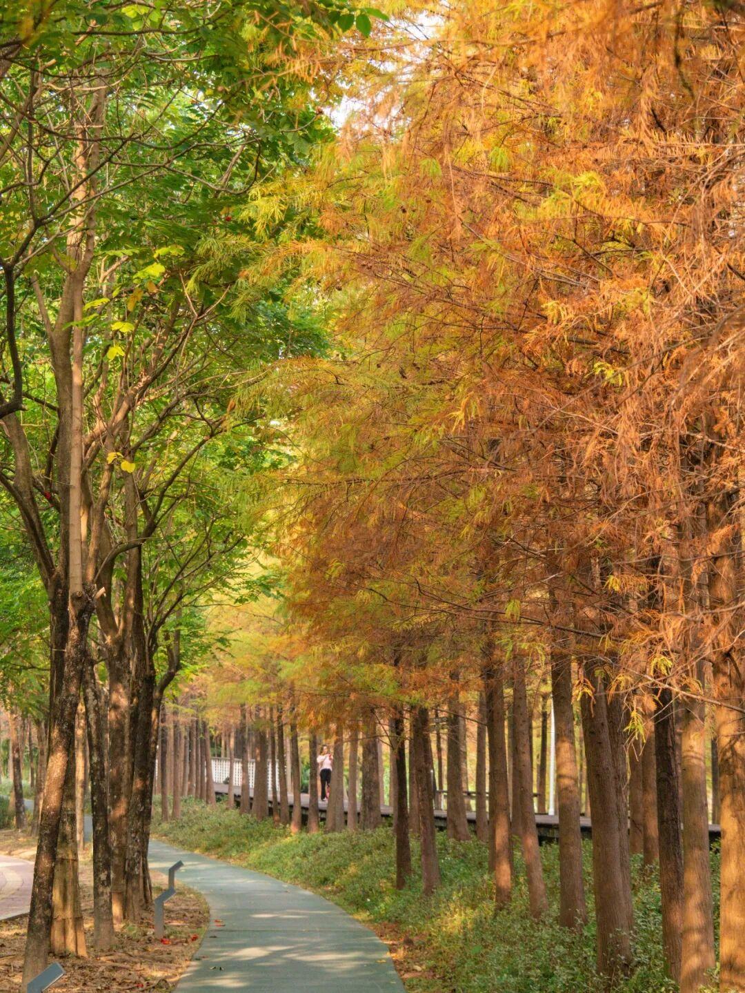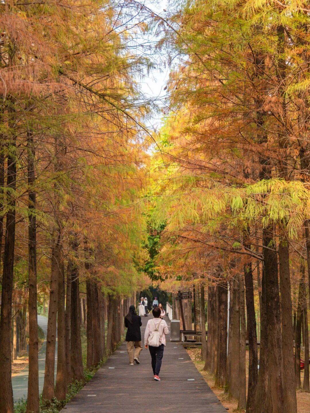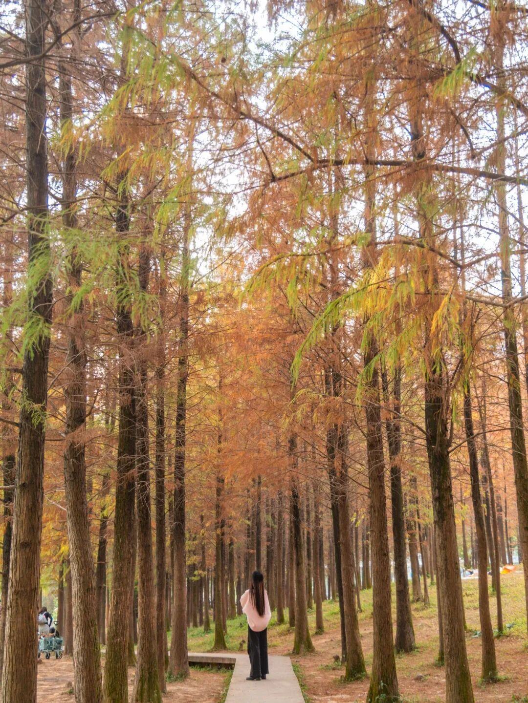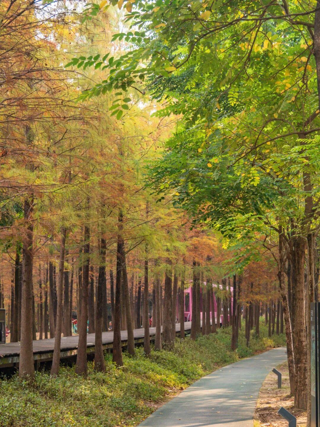 天河大观湿地公园北门附近的这片落羽杉林,地面有坡度,林间分布着池塘,林中架设了木栈道,处处都能拍出极具文艺感的照片。