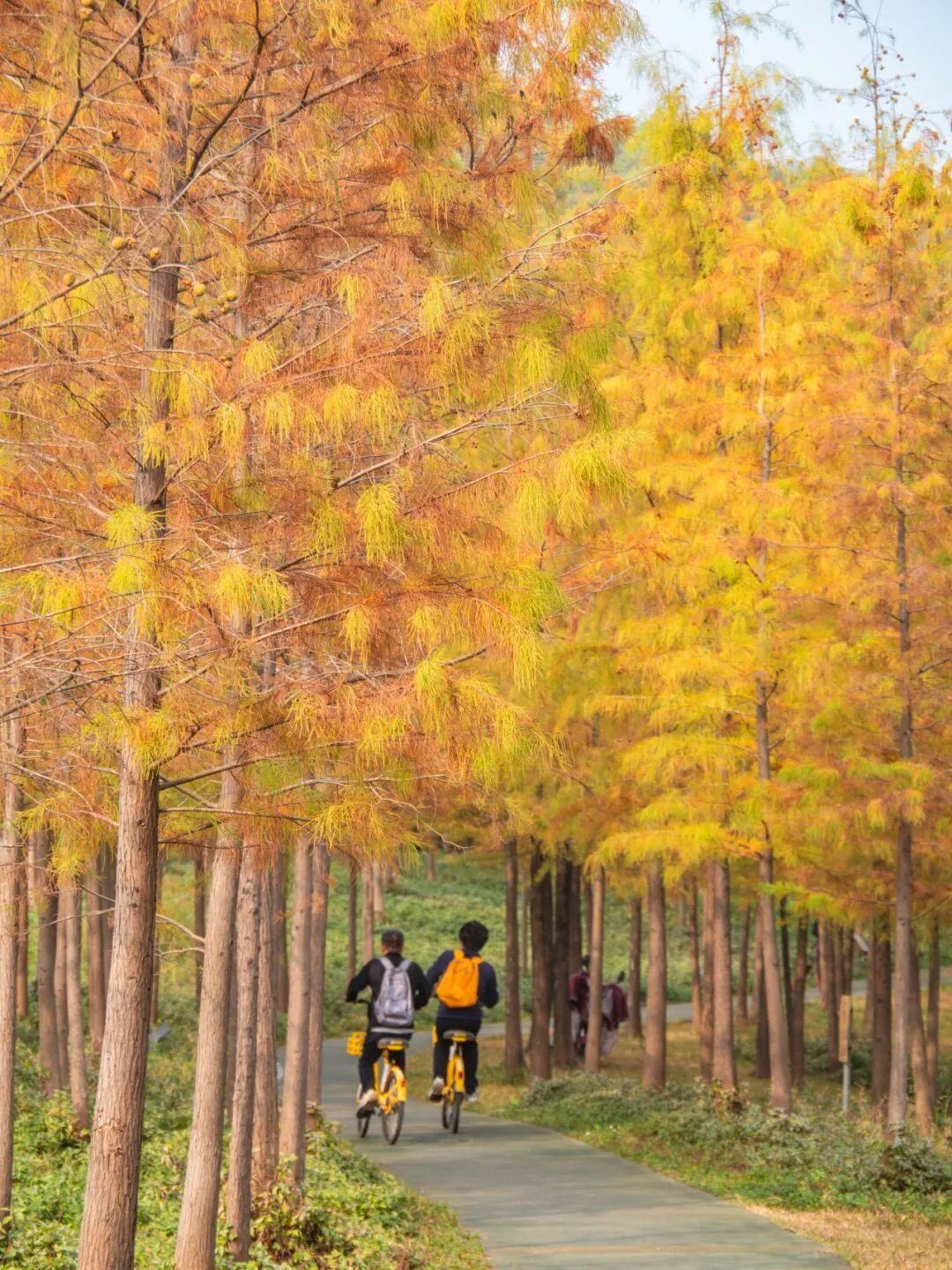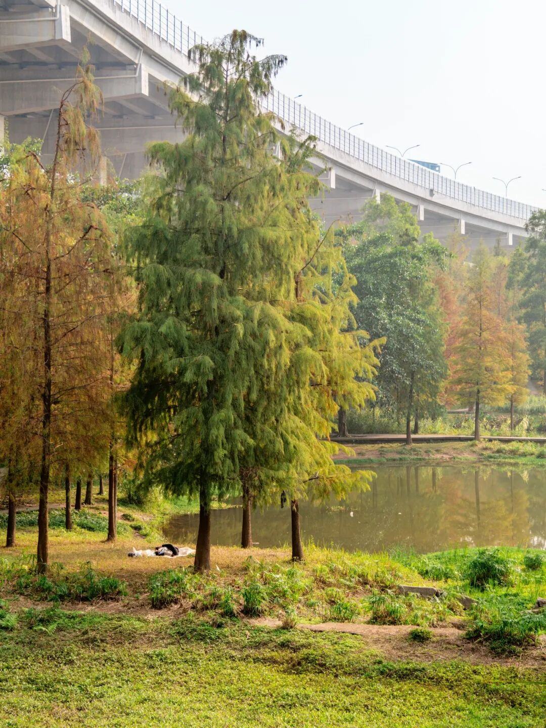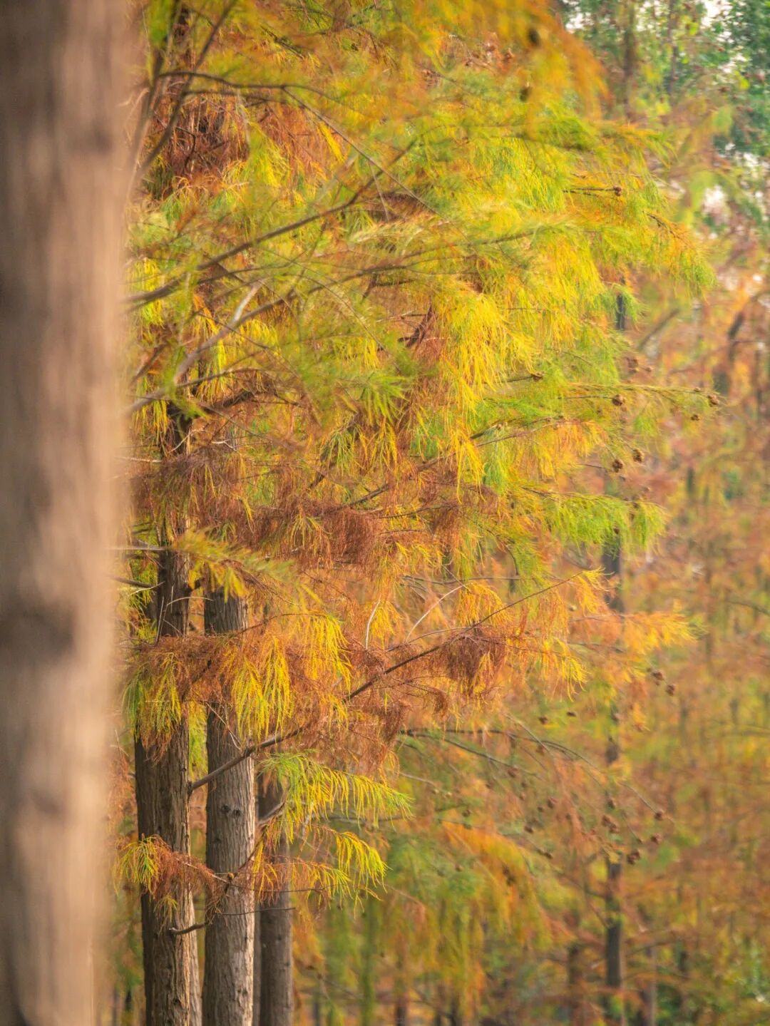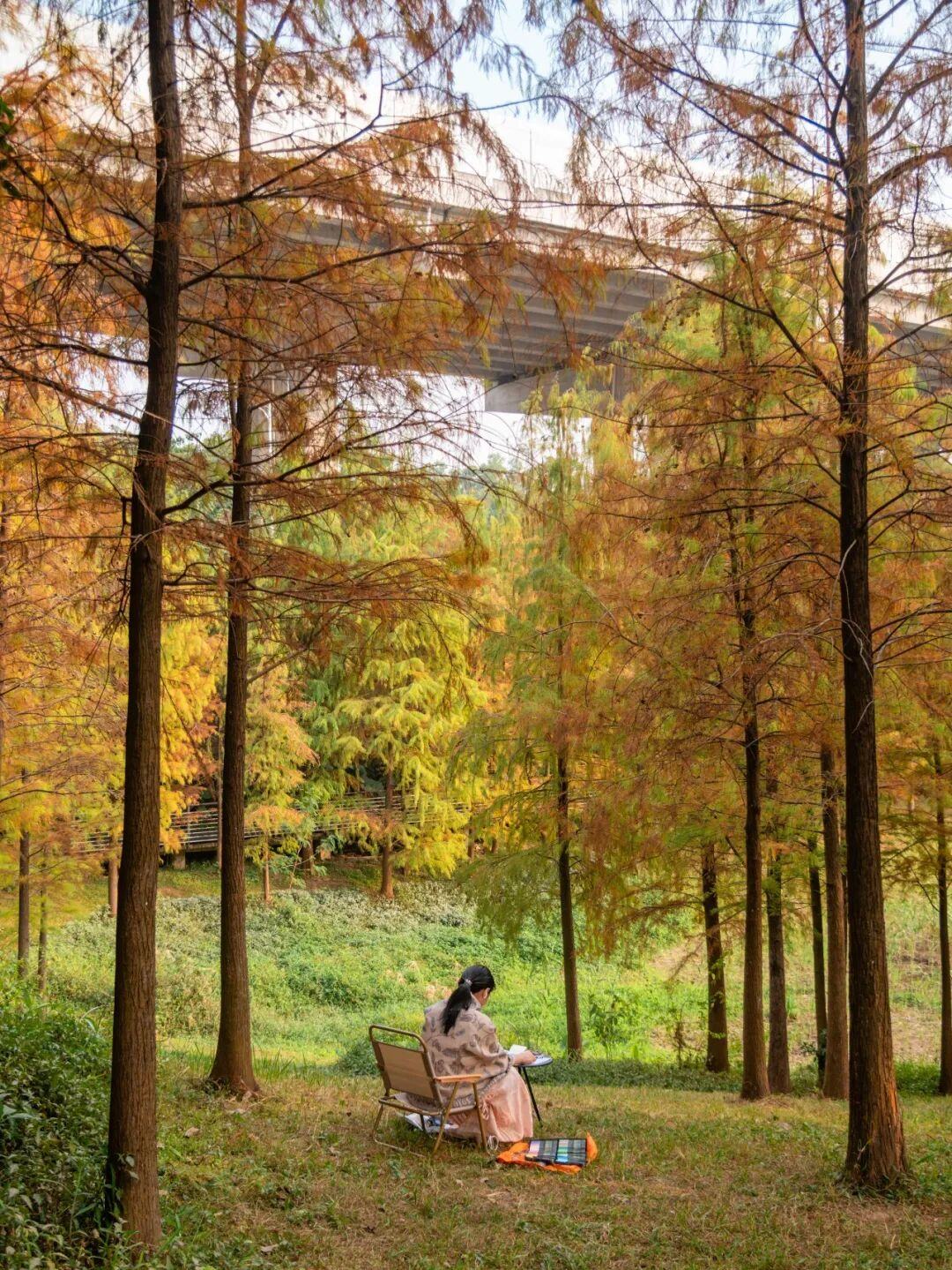 天河大观湿地公园北门附近的这片落羽杉林,地面有坡度,林间分布着池塘,林中架设了木栈道,处处都能拍出极具文艺感的照片。