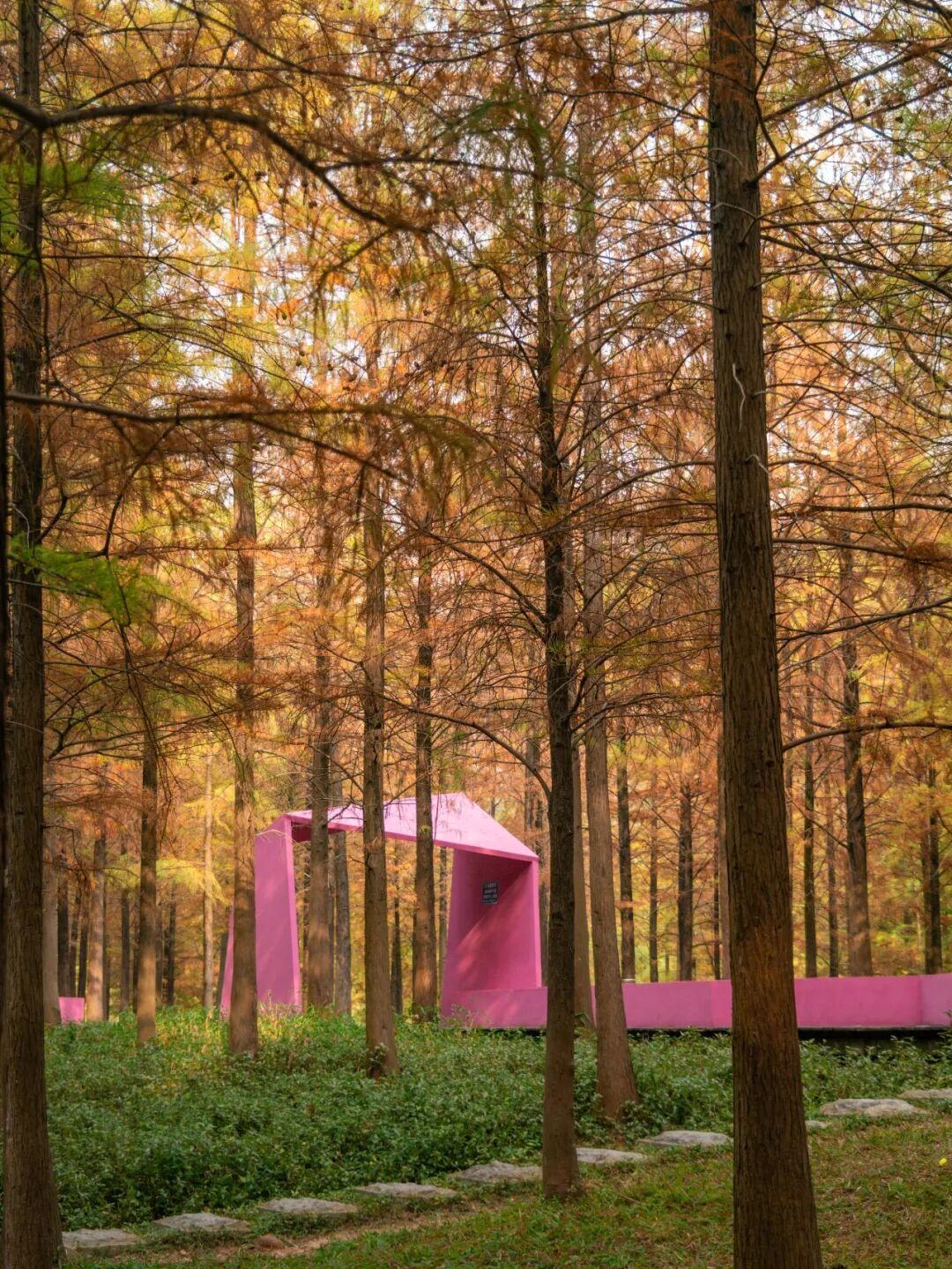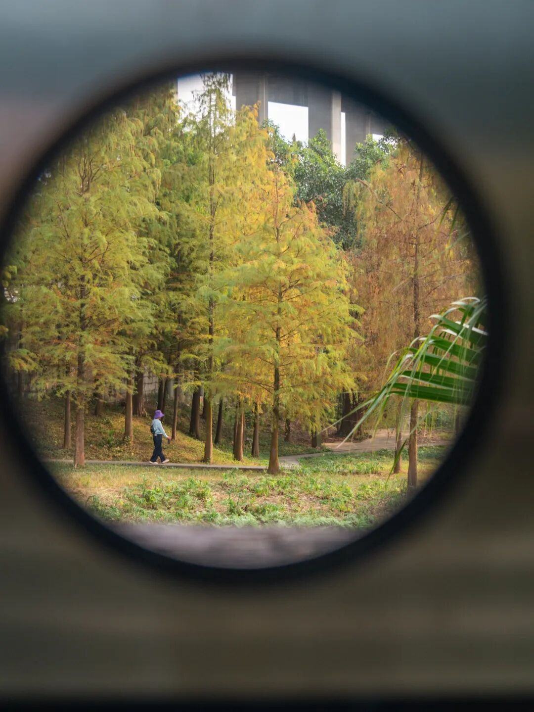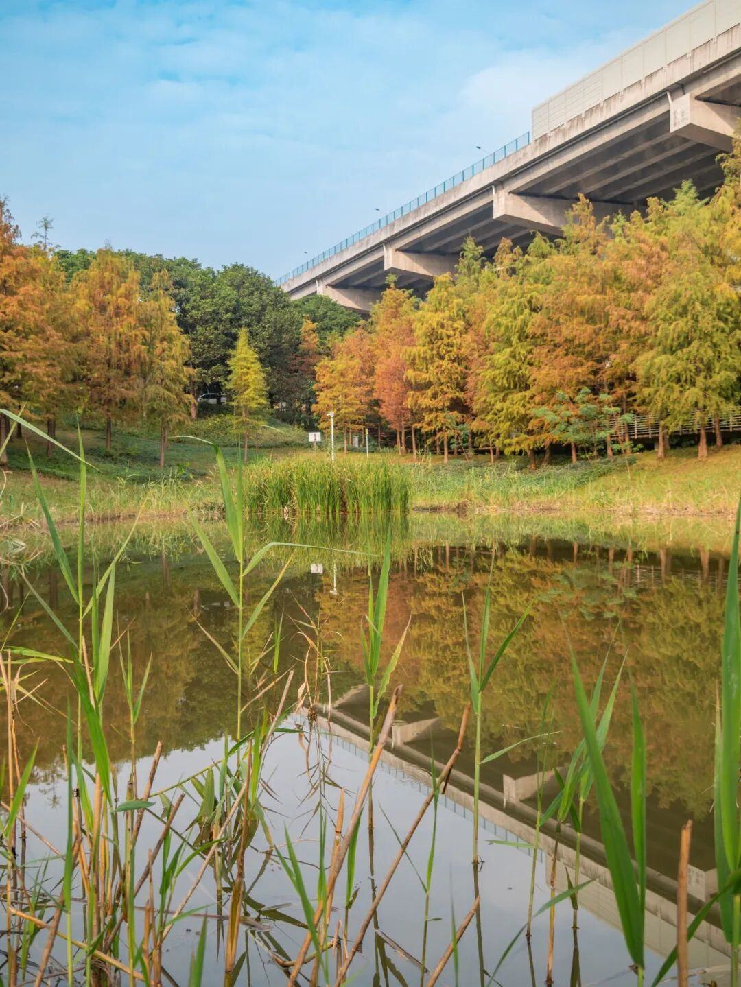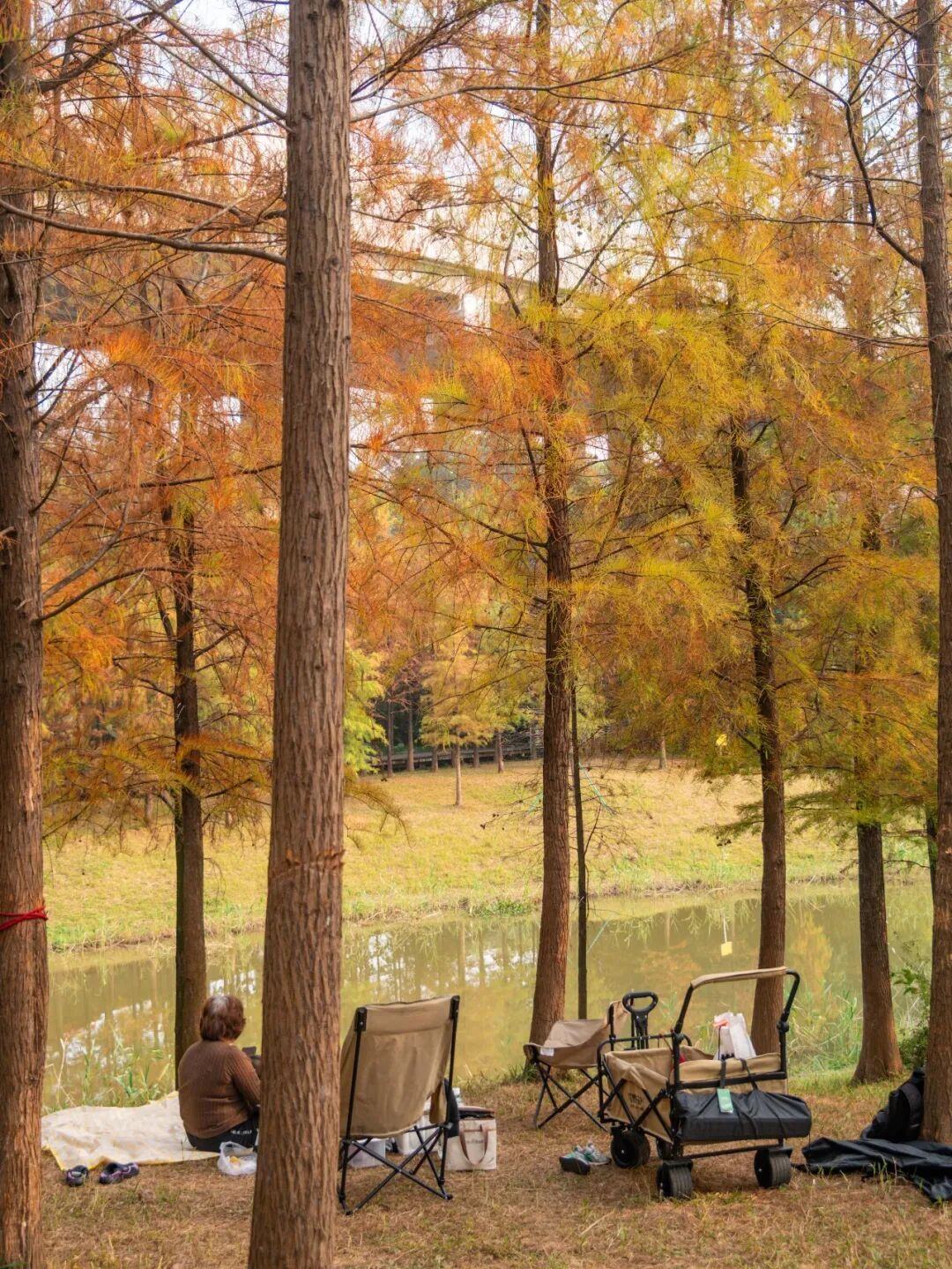 天河大观湿地公园北门附近的这片落羽杉林,地面有坡度,林间分布着池塘,林中架设了木栈道,处处都能拍出极具文艺感的照片。