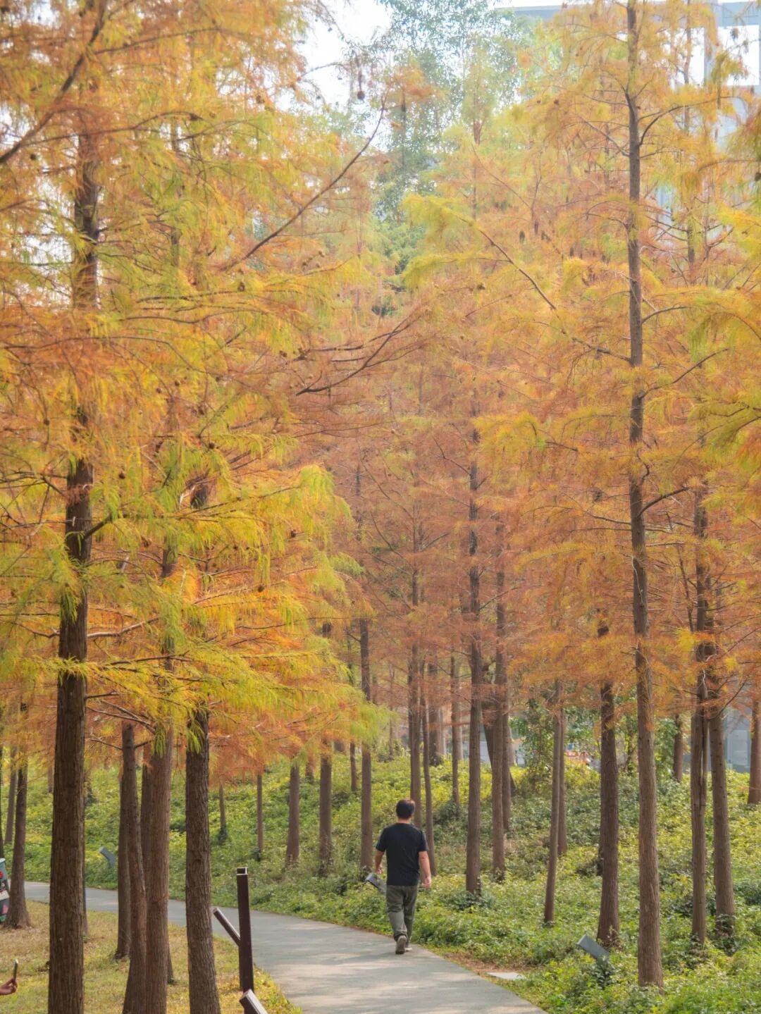 天河大观湿地公园最壮观的落羽杉美景位于公园北门附近,这边有一片密集的杉林区,这里的落羽杉已经大片变红。