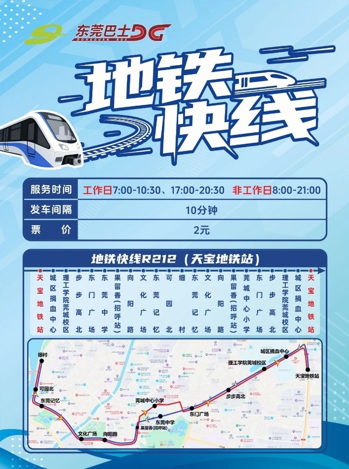 为迎接东莞记忆二期项目开放,给市民提供更顺畅的游玩体验,12月15日,东莞市莞城街道联合东莞巴士推出“地铁快线R103”,实现“轨道+公交”无缝衔接到东莞记忆。本周日(12月28日)东莞记忆“地铁快线R212”将开通,为市民和游客再次增添了一条乘地铁畅游东莞记忆的便捷快线。