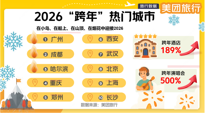据此,美团旅行发布了2026“跨年追光”十大热门玩法,包括:看跨年烟花秀或无人机表演、在跨年演唱会唱响心中的光、坐船“驶向”2026第一缕晨光、在雪地光芒中“滑进”2026、搭乘午夜航班“飞入”2026看万米高空晨光、入住山顶酒店拥抱云海与晨曦、在小岛看海上日出、住雪山酒店看日照金山、参与跨年篝火露营看满天星光。