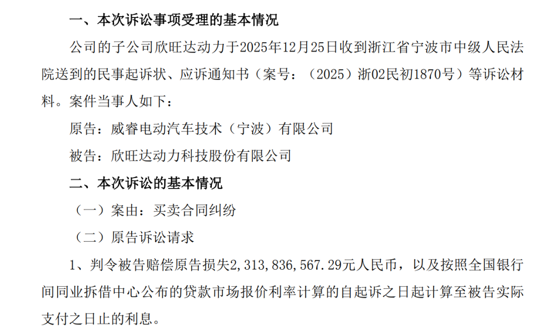 12月26日,欣旺达电子股份有限公司发布公告披露,其子公司欣旺达动力科技股份有限公司于12月25日收到浙江省宁波市中级人民法院送达的诉讼材料,被威睿电动汽车技术(宁波)有限公司以买卖合同纠纷为由起诉,索赔金额高达23.14亿元及相应利息。这一诉讼将曾紧密合作的上下游企业推向对立面,也引发新能源汽车行业对动力电池质量的广泛关注。