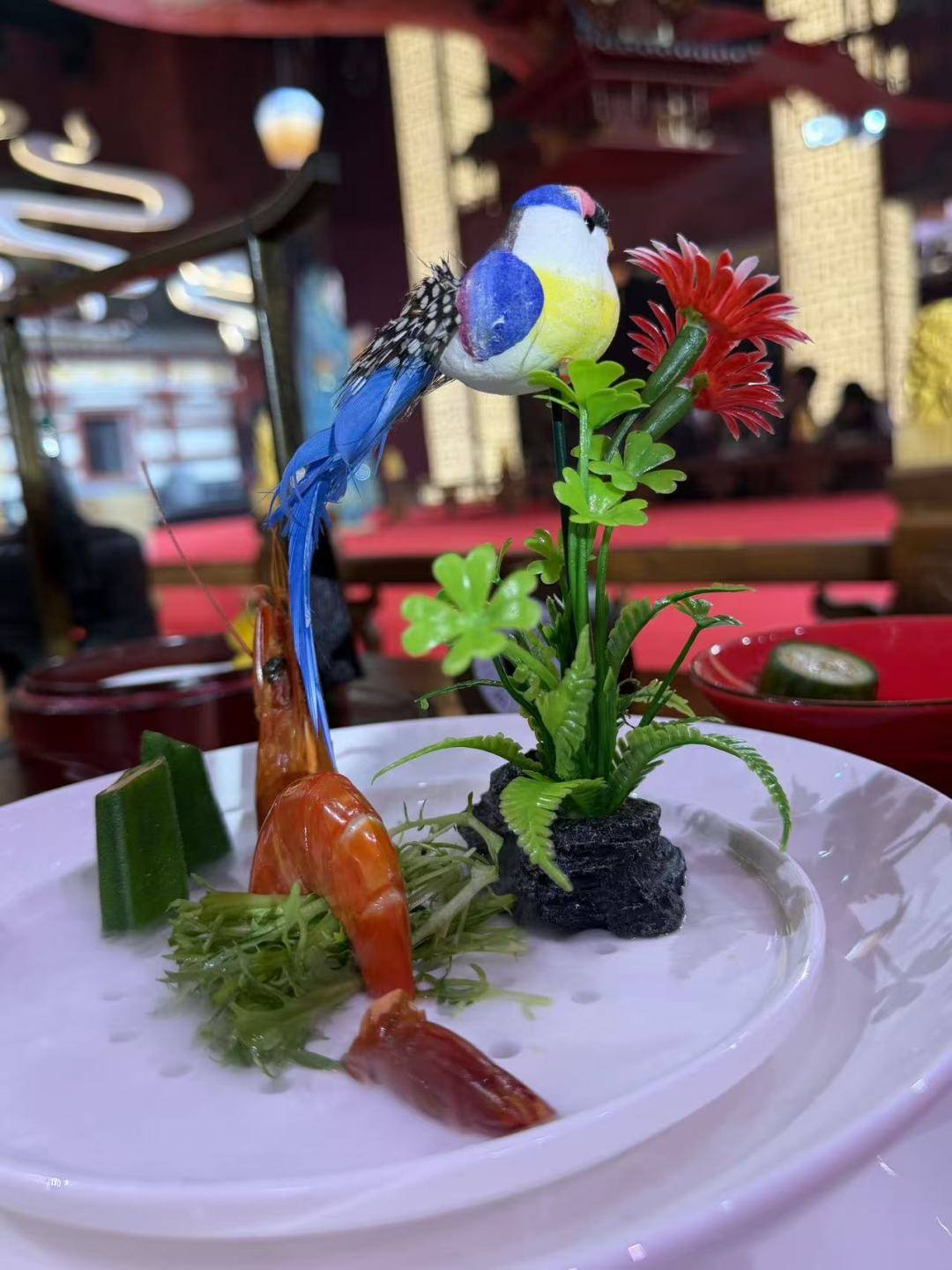 深入研究岭南民俗、戏曲、建筑等元素,从粤剧水袖、广彩瓷器中汲取灵感,让文化符号自然融入场景设计、餐具摆盘与菜品创作。每道菜品命名与呈现均融入历史典故、非遗技艺或民俗元素,宴席全程穿插粤剧、醒狮、武术、广绣等表演及丝绸之路拍卖等互动环节,让宾客多维度参与,成为文化体验的一部分,而非单纯的味觉消费。