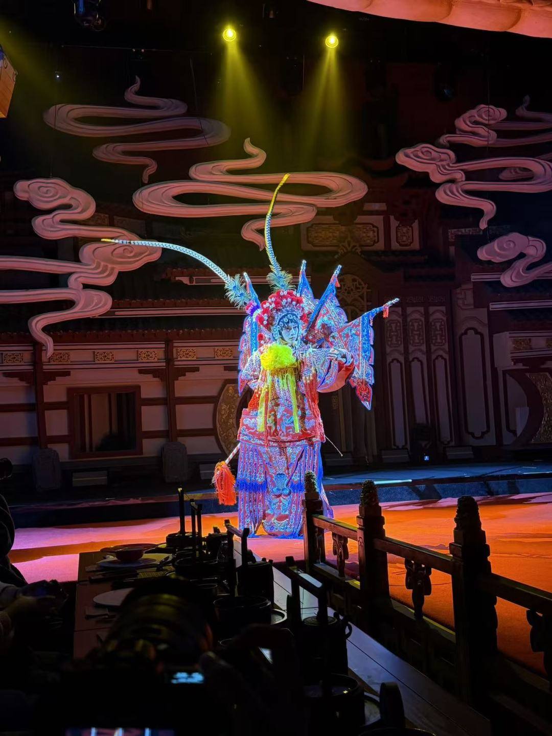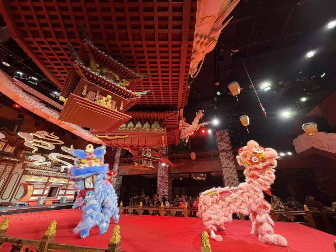 整场演出像穿越到古代宫殿,亭台楼阁、灯笼高悬,NPC穿着汉服穿梭其间。全程剧情式演出,水袖、醒狮、民乐轮番登场,非遗瞬间“活”了过来。