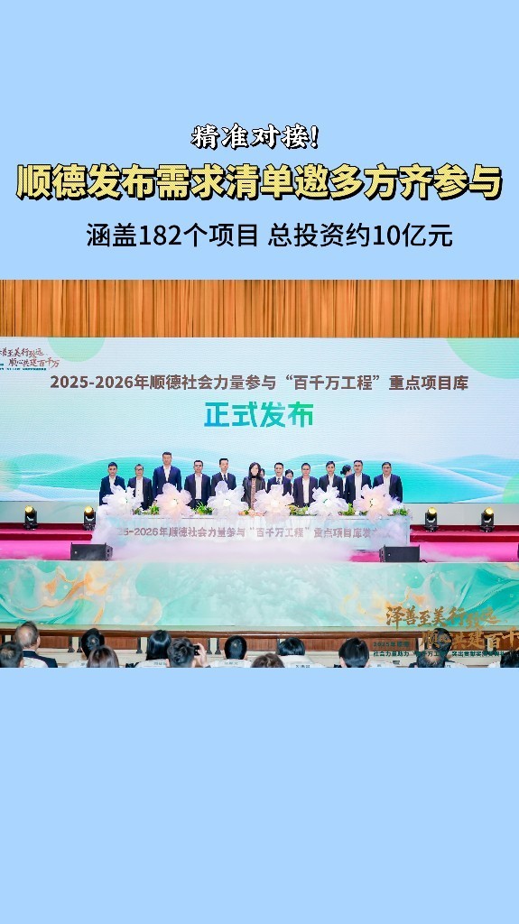 12月26日,佛山市顺德区发布《2025-2026年社会力量参与“百千万工程”重点项目库》。项目库梳理出涵盖教育、养老、产业、文化、生态等领域的182个重点项目,总投资规模近10亿元,这标志着社会各界力量参与“百千万工程”从“自发贡献”迈向“精准对接”阶段。