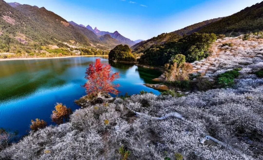 南山湾畔的枫香树与漫山梅海交相辉映。园方供图